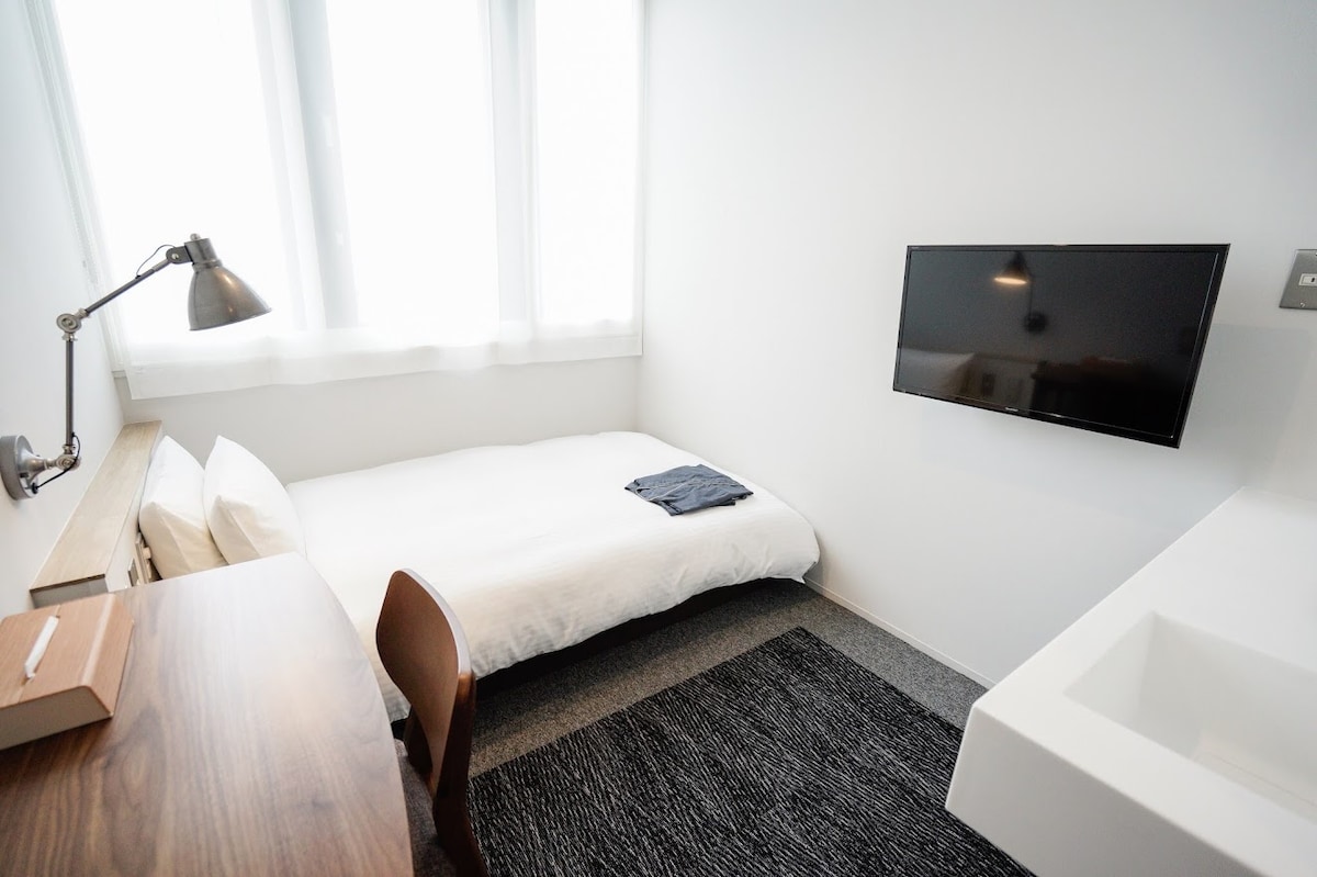 Simple and calm guest room. Enjoy a comfortable journey in a space equipped with shower booths and amenities. Free Wi-Fi is available throughout the building, and you can enjoy the internet in your room or at the cafe on the first floor. We have a semi-double bed with a bed size of 123 cm. <Equipment> 32-inch LCD TV, shower, wash basin, reading light, desk, chair, Fully equipped with air conditioning, refrigerator, hair dryer, electric kettle, etc.