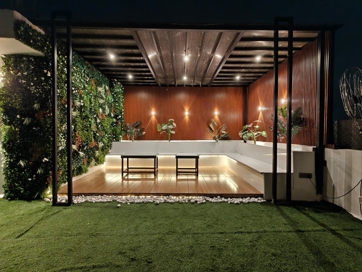 Mind Expanding Space, a Secret Hide-Out Bedroom w/ Jacuzzi - located in the Heart of South Delhi-Gk1 (LaneNo.1, N-57-Gk1) is a 1BHK Bedroom Suite with attached toilet, overlooking a large Jacuzzi and a Sun Lounger deck for sunbathing with outdoor shower. There is a Outdoor Kitchen with Dining area, Weber BBQ, some herb gardens and a lawn with a Daybed and Swing. Equipped with SwimSpa Pool 16'x8' ft / Large Private Jacuzzi, surrounded by grass walls for full privacy. Total area:1100Sqft