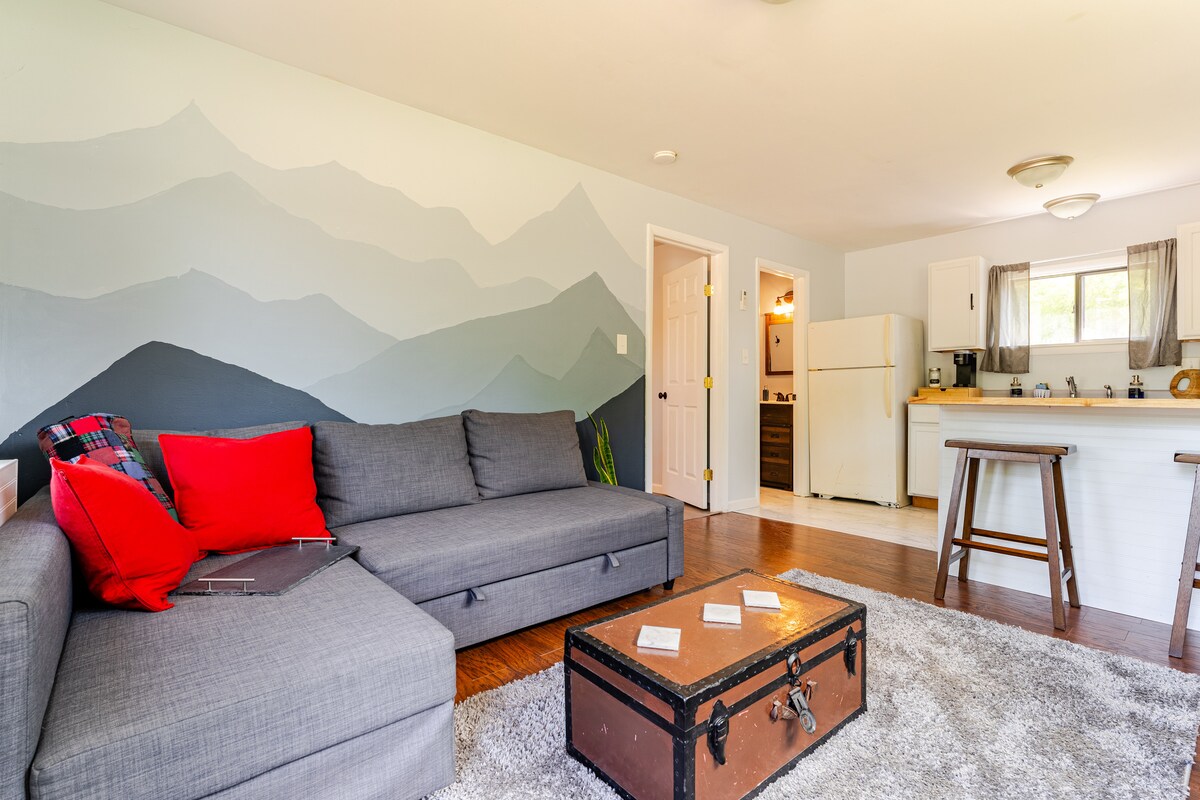 Kick back and relax in this peaceful, stylish two-bedroom home that is centrally located for easy access to skiing, biking, hiking, and exploring. The Camp features beautiful Mountain Views and sits on a wooded hilltop to escape the busy city life. The Camp interior is newly remodeled with all new appliances and furniture. It has two bedrooms, one bath, a fully equipped kitchen and a washer/dryer. One bedroom has a king-sized bed and the other has a queen-sized bed. Come get away and relax!