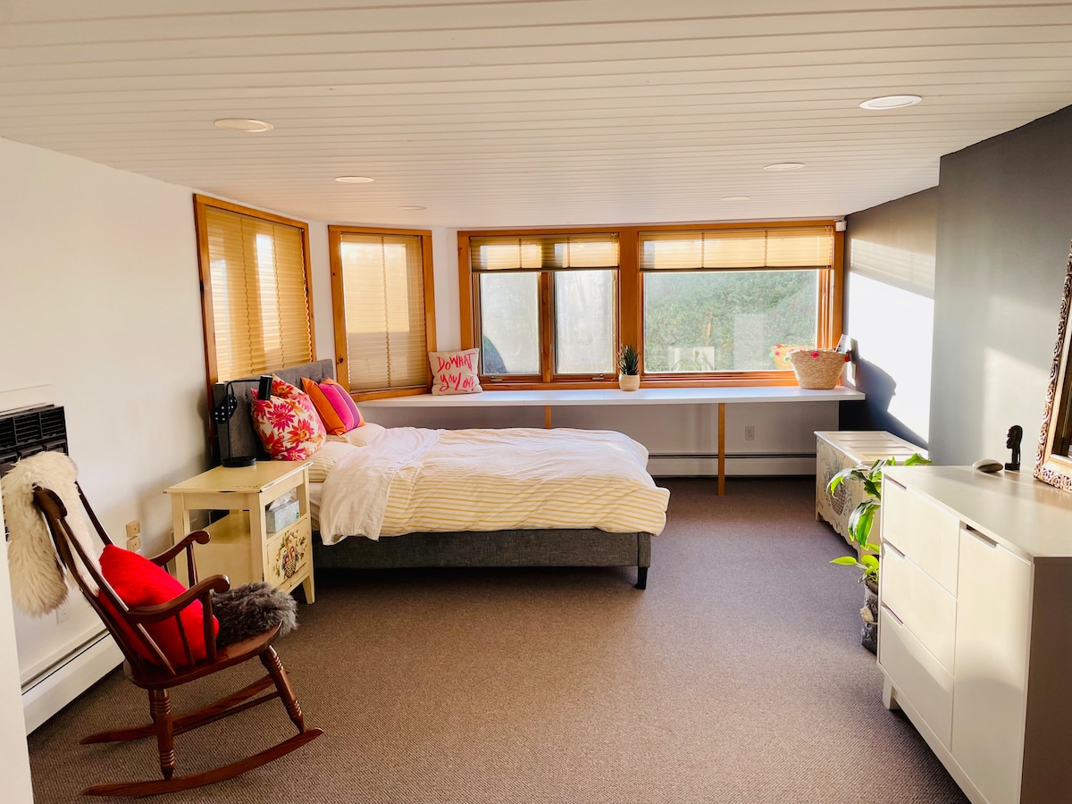 NEW! Very roomy 600 sq ft suite in quiet neighborhood, walking distance of 5-corners, 5 miles to Burlington. Vaulted ceiling, sky lights, extra large windows and a sliding glass door (leading to a balcony) make for a very bright and comfortable space! Walk in closet, full bathroom (2 sinks) and a brand new king-size bed. Kitchenette area that has refrigerator/freezer, new coffee maker, toaster, toaster oven, microwave and 2-burner cooktop suitable for simple meal cooking. Private entrance.