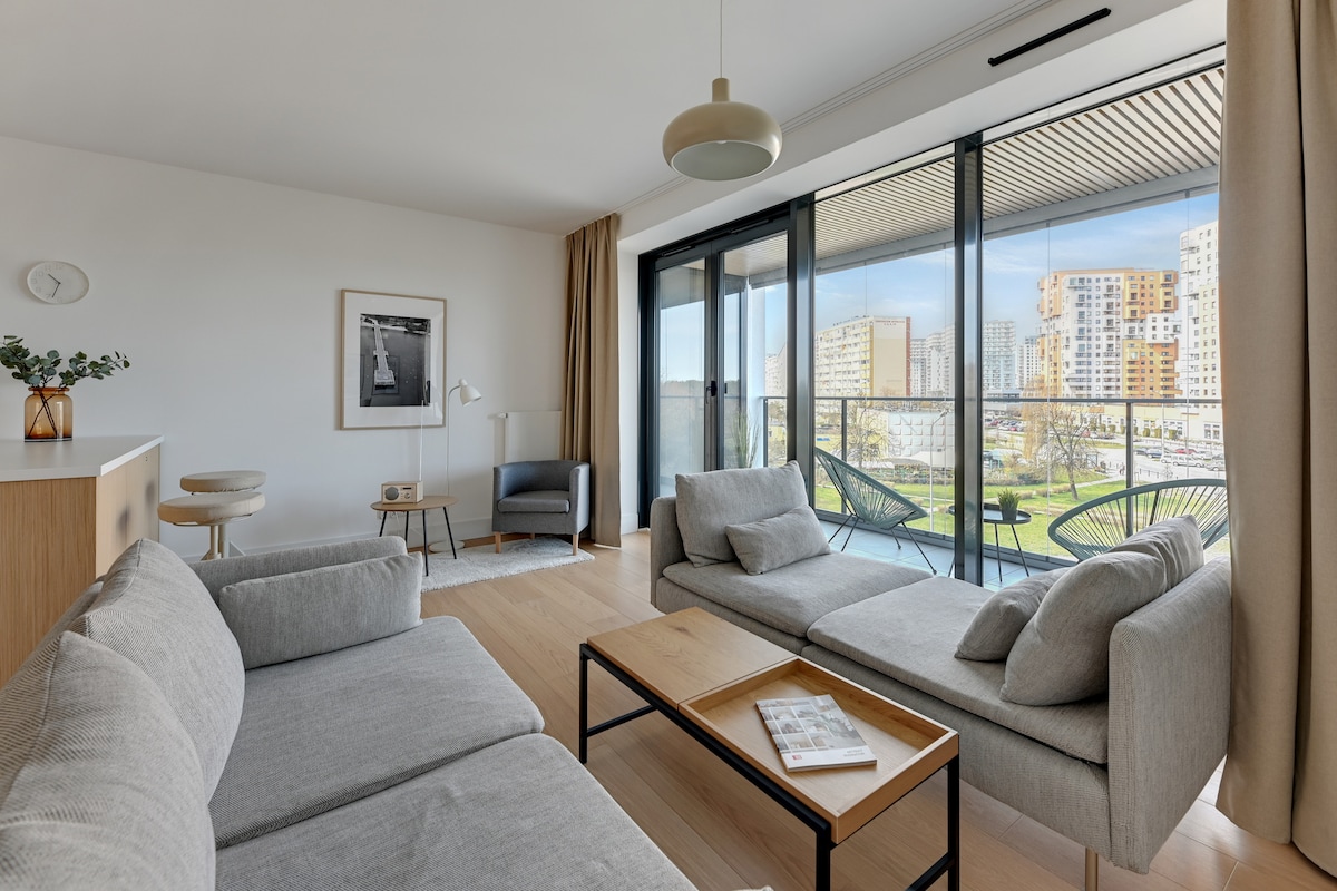 This stylish place is ideal for groups and families. Spacious apartment, 120 squaremters, 3 bedrooms, huge living area: living room, dining room and kitchen with the most beautiful view of the panorama of the Old Town Gdańsk. Guests can admire the views from both: the terrace and the windows of the apartment. We offer all the comforts, access to the fitness area and saunas, free parking space.