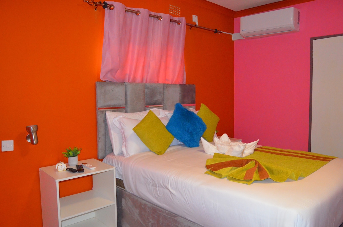 Standard room which consist of 1 double bed for 2 guests.but It has enough space for an extra bed up on request in the same bedroom for families or sharing purposes at an extra cost of $35 per guest,but only a maximum of 4 adults guests allowed sharing 2 double beds.has a kitchenette inside and kitchen utensils for self catering purposes.with bar fridge,sink unit,electric stove with oven,TV ,dining area with dining table for 2 and free WiFi .