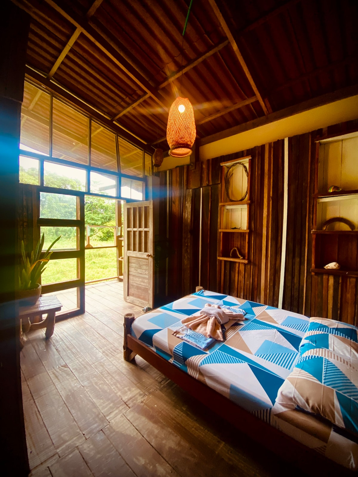 Arakari es una Cabaña con una habitacion en el tercer piso, con vista a la bahia y al jardin. Es de madera, con ventanales, rodeada de bosque húmedo tropical . Se encuentra ubicada en una pequea reserva natural a 5min caminando del muelle principal. Ofrecemos excursiones, actividades acuáticas (snorckeling, kayak y bodyboard) y experiencias gastronómicas propias del Caribe. La hab tiene detalles en una ventana y la presion de agua baja epoca de sequia. Lo demas es conexion Natural
