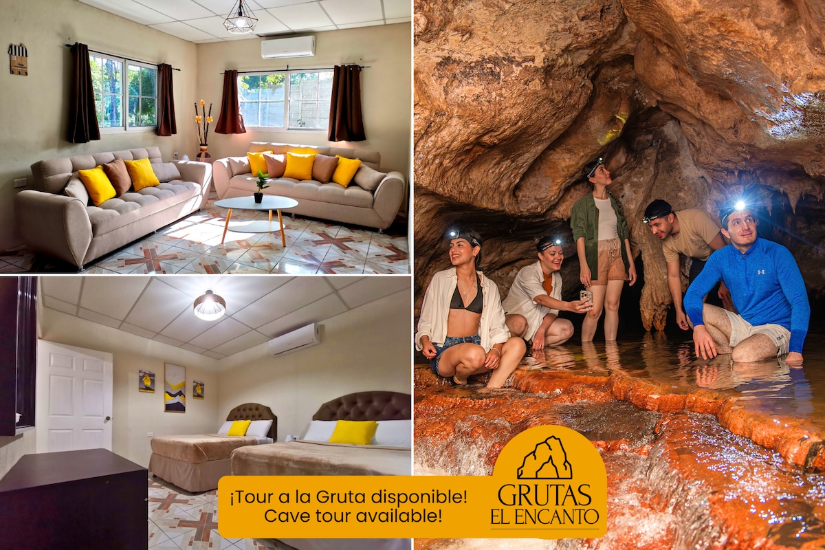 An Airbnb next to one of the most fascinating caves in Guatemala? You’ve come to the right place! Just 18minutes from the Río Dulce bridge in Izabal, on the way to Petén, Casa de la Colina is more than just a cozy stay at Grutas el Encanto: it’s your gateway to adventure. While staying with us, book a tour to explore our cave, featuring underground rivers and ancient rock formations, all within the property itself. We can also recommend many nearby destinations for you to discover. See you soon!