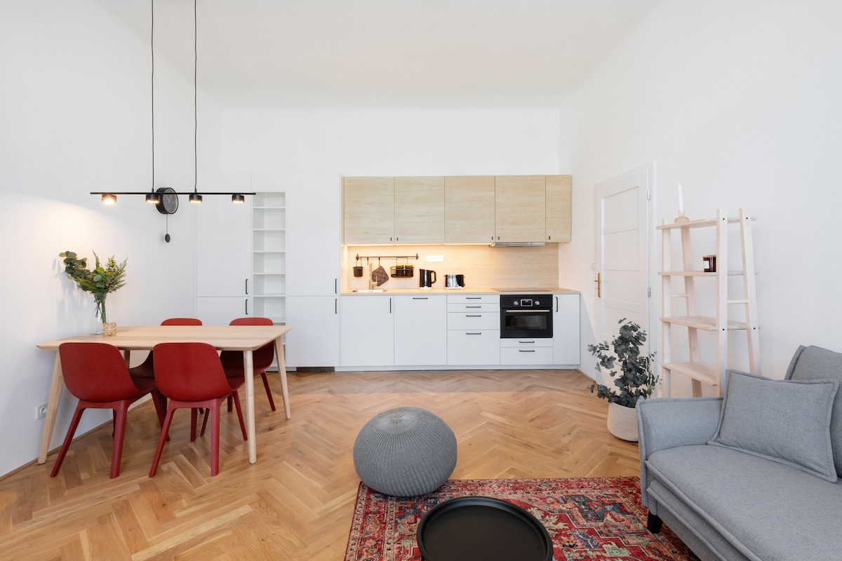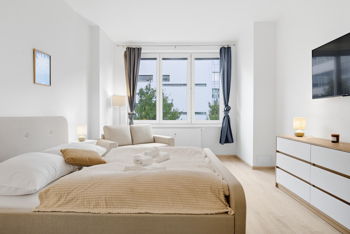 Spacious and light place with unigue views in old residatial neighborhood. Luxuriously furnished apartment offers comfort at every moment of your stay. Fully equipped kitchen, bathroom with shower and bathtub with a breathtaking view, TV with Netflix, quiet bedroom with a comfortable bed. Cafes, bakeries and bistros, pubs with the best Czech beer and cuisine, a local market right next door. Direct public transport to the airport, train station, Prague Castle, Old Town Astronomical Clock.