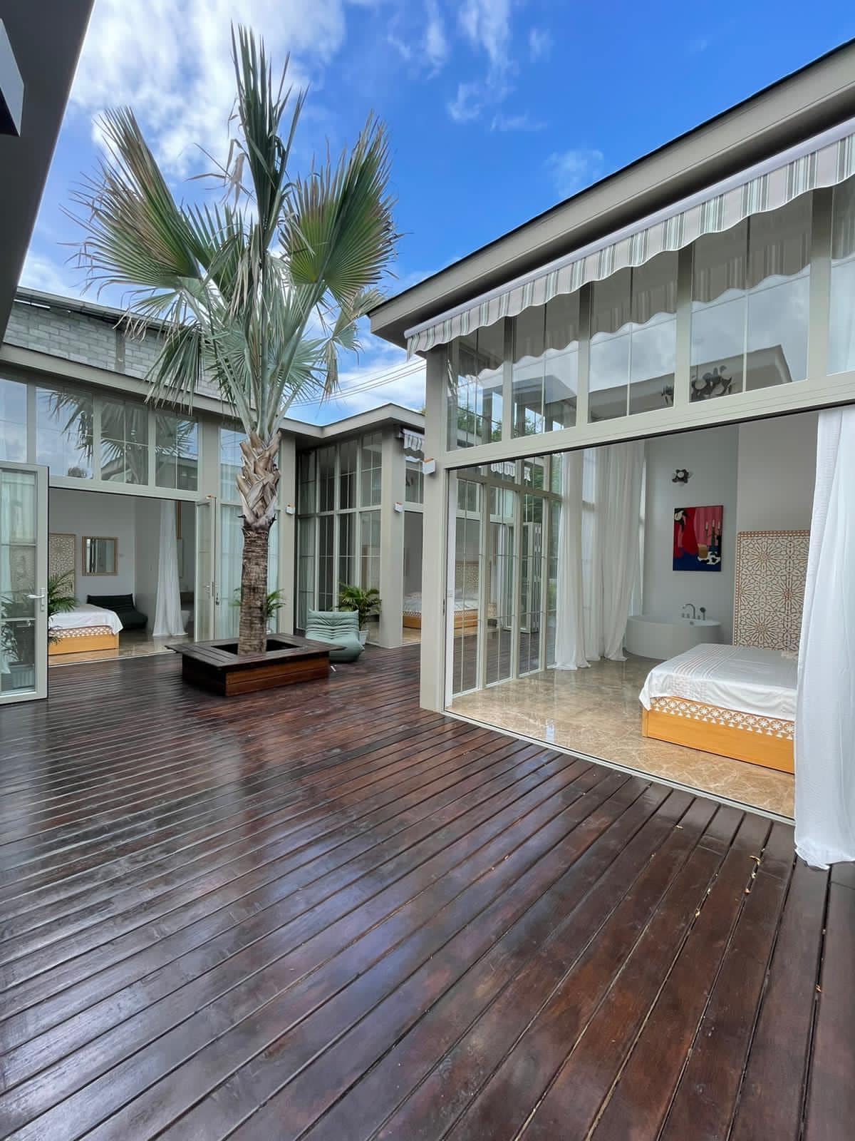 this villa is in a residences what do have there own beach we share a bay with the hyatt regency our villa have 3 bedroom and also 3 bathrooms and a nice outdoor shower a privat infinity pool 4x6 meter and a huge shared Community pool villa 29 is just 1 min to wall to the beach and 50 meters away form the beach you do have a fully equipped kitchen and also a huge living room with a huge dining table an big sofa and a flatscreen all rooms are equipped with new Airconditions