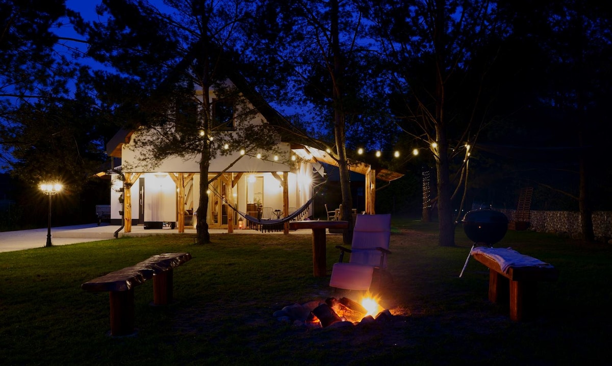 Your Private Luxury in the Heart of Nature Welcome to a unique thatched-roof home nestled deep within the forest, in the buffer zone of the Bory Tucholskie National Park – no neighbors, no noise, just you, nature, and pure comfort. This is a place created for those who dream of escaping the world. Enjoy exclusive access to 0.5 hectares of fenced land, featuring three spacious terraces, a forest-view jacuzzi, a modern outdoor kitchen – perfect for unforgettable evenings under the stars.