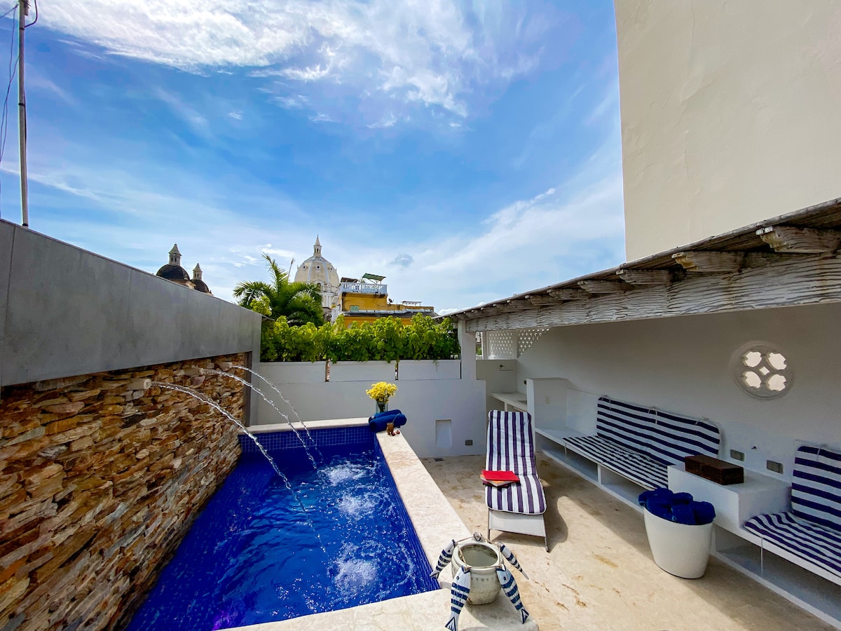 This stylish unique house is located in the Centro Historico of Cartagena, in the trendy neighbourhood of San Diego. It is a tasteful home for a romantic hideout. This property offers a refreshing private pool, a small rooftop terrace perfect for sunset cocktails, A/C where needed and the option to cater for 5 guests. Right next to great bars and restaurants, this stylish Historical Colombian home is filled with great details, high ceilings, wooden beams, antique bath, and quality amenities.