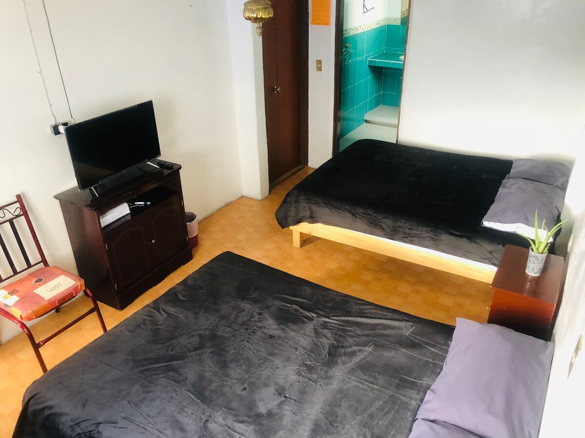 Habitación en primer planta con una cama matrimonial y baño privado. Nos encontramos a un costado del Hospital la Beneficencia Española 2 km de zócalo de Puebla 300 m de la Av Juárez 300 m del museo del Ferrocarril 100 m de Oxxo Hay estacionamientos y pensiones públicas a cuadra y media del alojamiento. Depende el número de personas es el precio. Cupo máximo 2 personas. Fácil acceso a transporte público y rutas a diferentes puntos de la ciudad de Puebla.