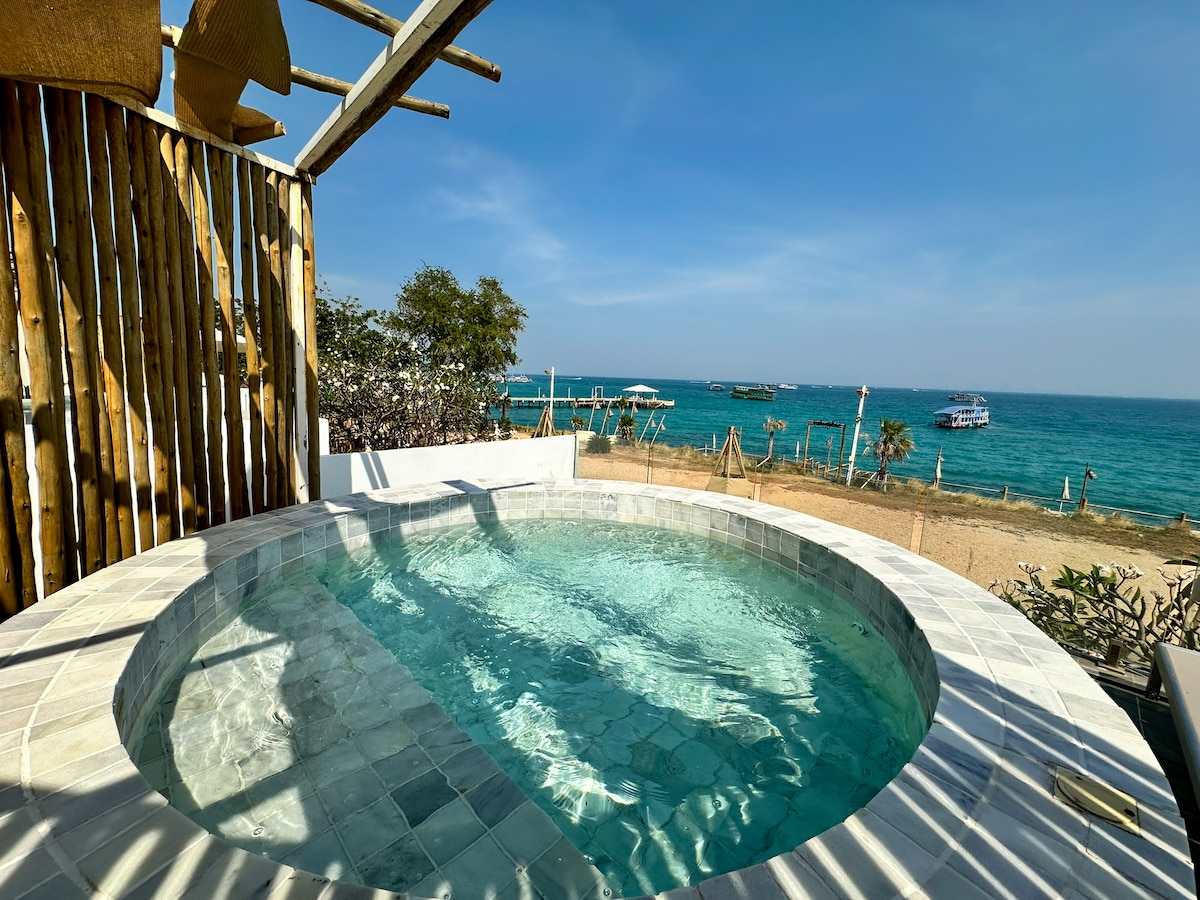 Approximately 200 degree of stunning ocean views, probably unmatched on the island of Koh Larn. Access to its own beach. 200 sq meters of living space. Brilliant, Thai Art Deco, design. One large master bedroom en suite , tastefully decorated, Large dining room, living areas, library, guest bathroom, 4 bedrooms, sauna, kitchen, outdoor verandas, with stunning views of the Pattaya Skyline. At night, the Villa transforms into a wonderland with an array of light features throughout the property