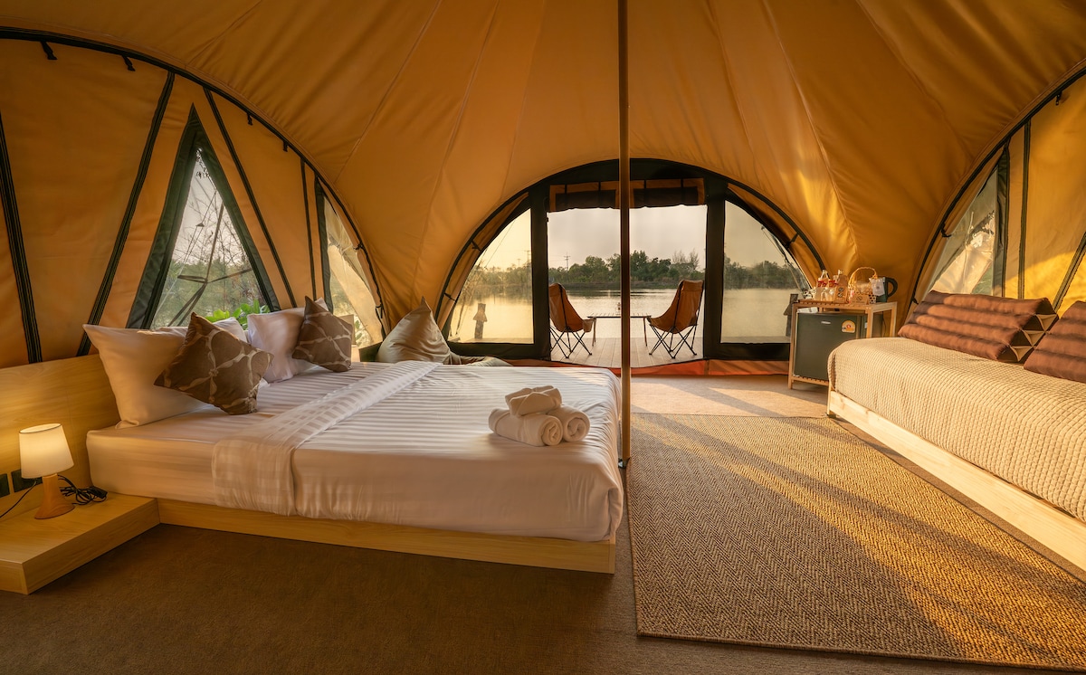 Welcome to the Glamping Breeze — your serene lakeside escape where nature meets comfort. Imagine waking up to tranquil water views right from your bed, as if you’re floating on the lake itself. Designed with extra space, this 36sqm space can host up to four guests, making it the perfect choice for couples, friends, or small families seeking a cozy getaway.* During your stay, you’ll have access to a well crafted communal bathroom that has both comfort and privacy. *Additional charges may apply.