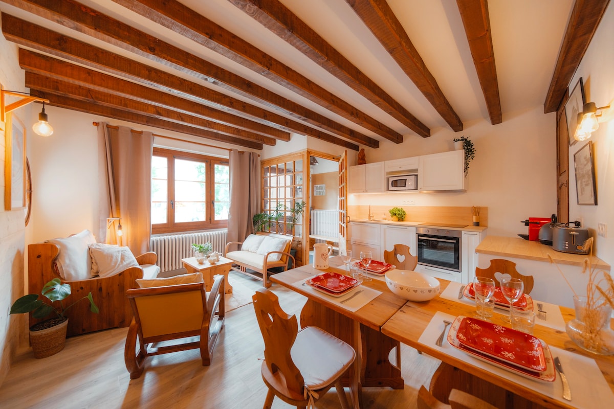 Situé en pleine nature propice à la détente. Déco zen et épurée. Le jacuzzi eau à 38°(marque USA-Softub) est ouvert toute l'année (de 10h à 21h, règle de bon usage) et un sauna ( 17h30 à 21h) à deux pas, accès compris dans le prix de la nuitée. Logement idéal pour accueillir un couple ou deux ami(e)s (lits séparables). Le petits-déjeuner d'accueil le 1er matin compris dans le prix du séjour. Pas de frais de ménage supplémentaire. À proximité du village et des commodités. Stations de ski proche.