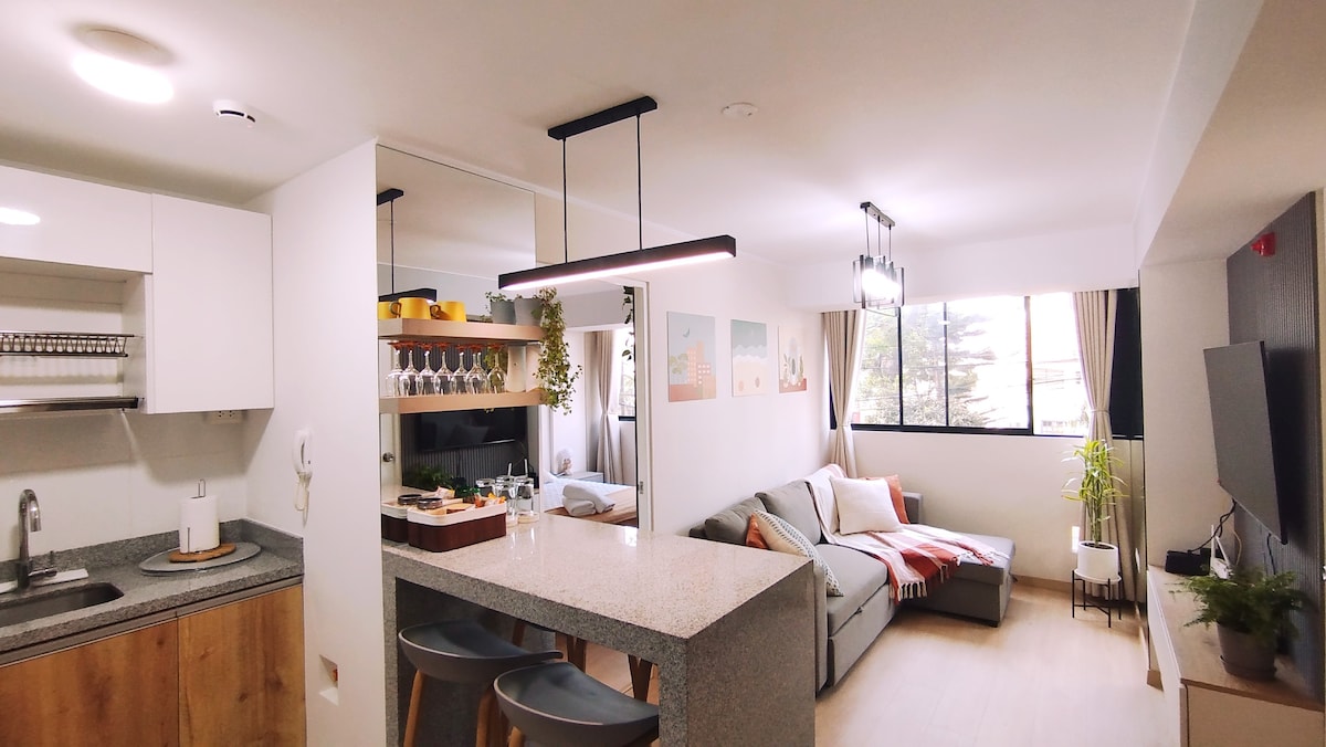 Brand new and cozy 1 bedroom flat in the best area of Barranco, close to restaurants, museums, parks and major roads. With living space of 40 m2, it comes fully furnished along with additional upgrades, also you will have beautiful views of Lima coastline It's located in a secure building that has Gym, Terrace, S. Pool, and additional areas as Function room and BBQ (T&C applies).