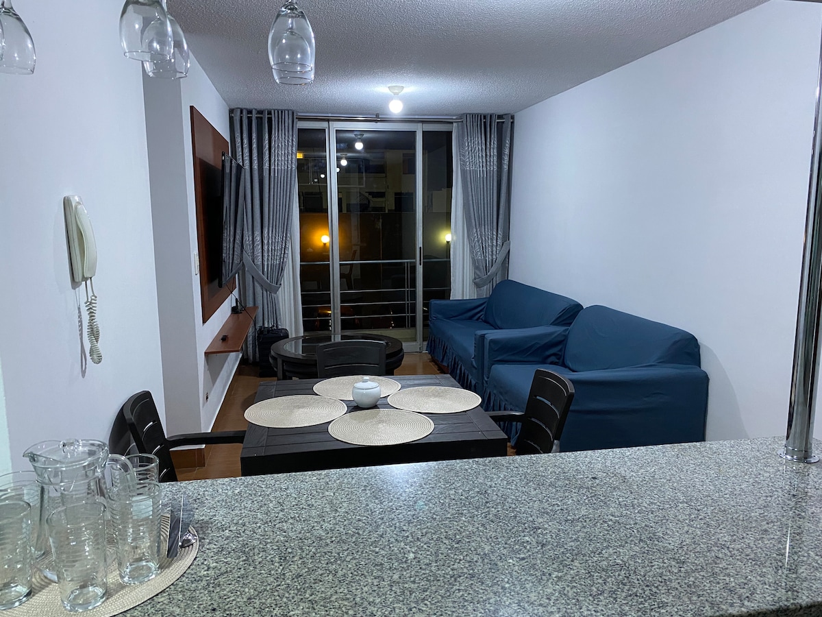 Es un apartamento cómodo, ubicado en el centro de miraflores a 1 cuadra del malecón, muy cerca a restaurantes, centros comerciales (larcomar), lugares turísticos, playas, entre otros. De 90 m2 de amplitud con 1 cama, 1 baño completo y 1 medio baño, 1 cocina, sala y comedor. El apartamento está en un sexto piso con ascensor. Un lugar muy acogedor y en uno de los distritos más importantes de Lima.