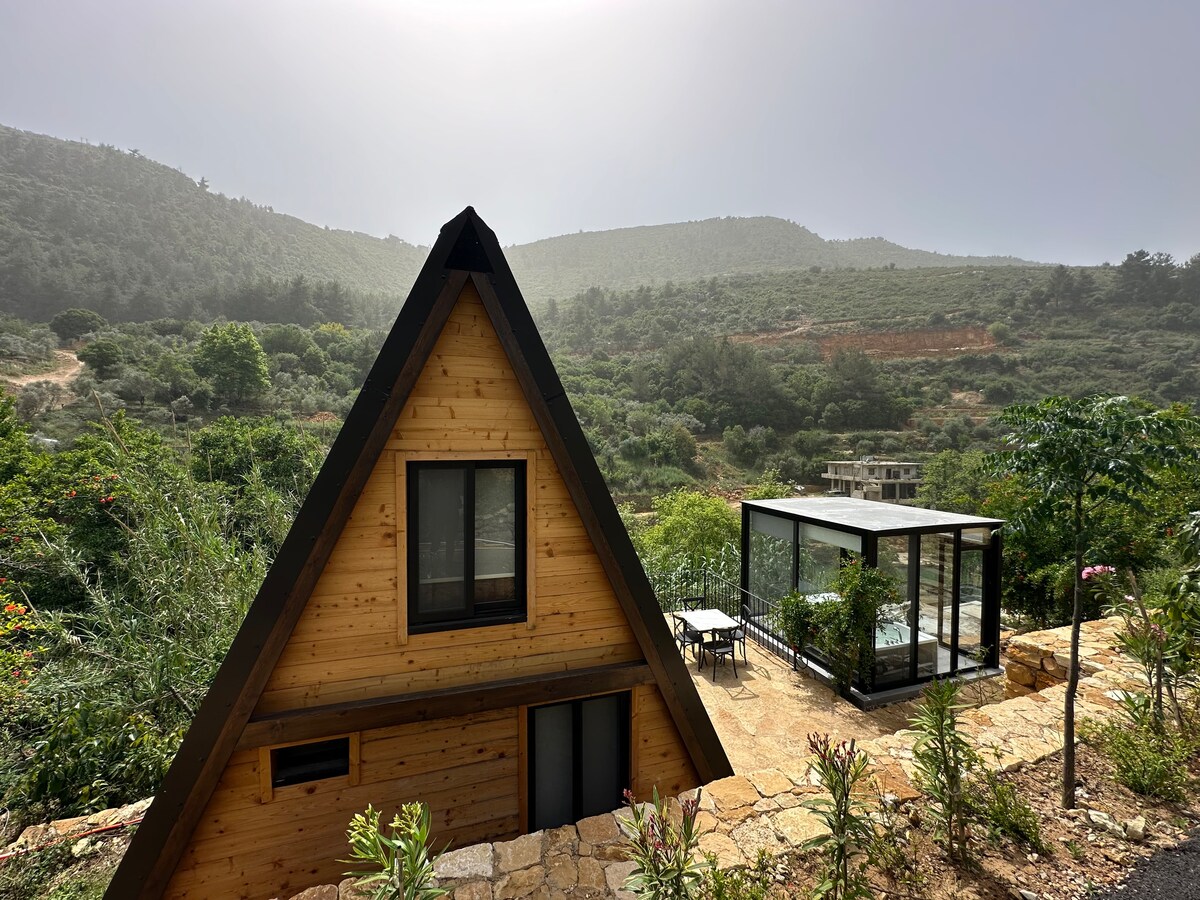 Kick back and relax in this A-shaped, stylish wooden cabin with spacious outdoor space and a private Jacuzzi . Hosted by Riverside Jahliye, located only 35 minutes away from Beirut. Have a walk by the tranquil river right next to your cabin and experience the ultimate mountain retreat. The cabin boasts a cozy interior with warm wood finishes, providing a welcoming atmosphere for relaxation after a day of exploring the scenic surroundings. Enjoy the mountain view from the comfort of your balcony.