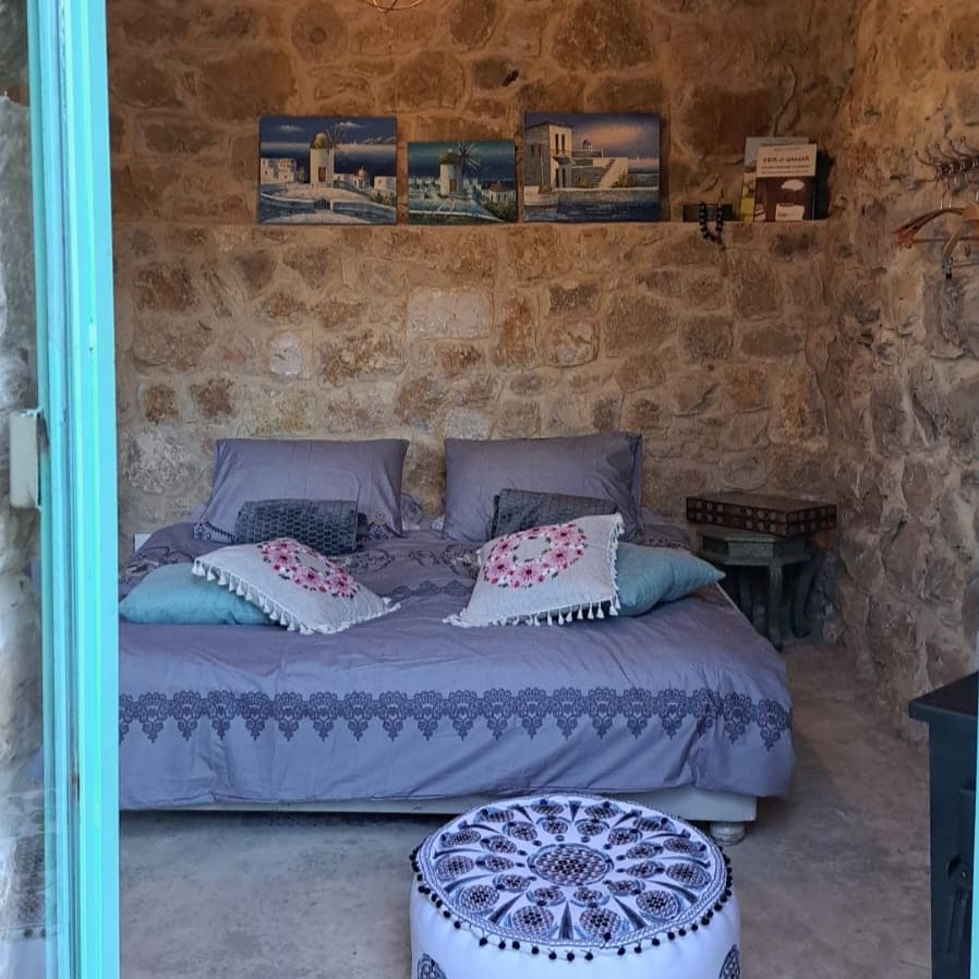 Cabin 1 – Beit Abir w Lama is a cozy wooden cabin, part of two cabins sharing an outdoor space and equipped kitchen. It includes a private bathroom, one small double bed, and a sofa bed. 🍳 Breakfast available for an additional charge ($15/person, $18 Sunday open buffet). Not included in the room rate. Please inform us in advance. Served outdoors in good weather or in our cozy art studio during winter.