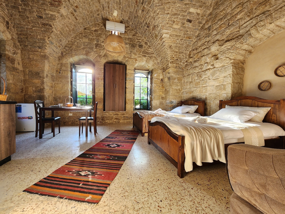 The mini guest house is a stone house situated near the FarmVille Barouk cabins. It is designed as a studio with a fully equipped kitchenette, a bathroom, and a bedroom (King-size floor mattress). The space accommodates up to 2 or 3 guests, depending on the request. 🍳 Breakfast available for an additional charge ($15/person, $18 Sunday open buffet). Not included in the room rate. Please inform us in advance. Served outdoors in good weather or in our cozy art studio during winter.