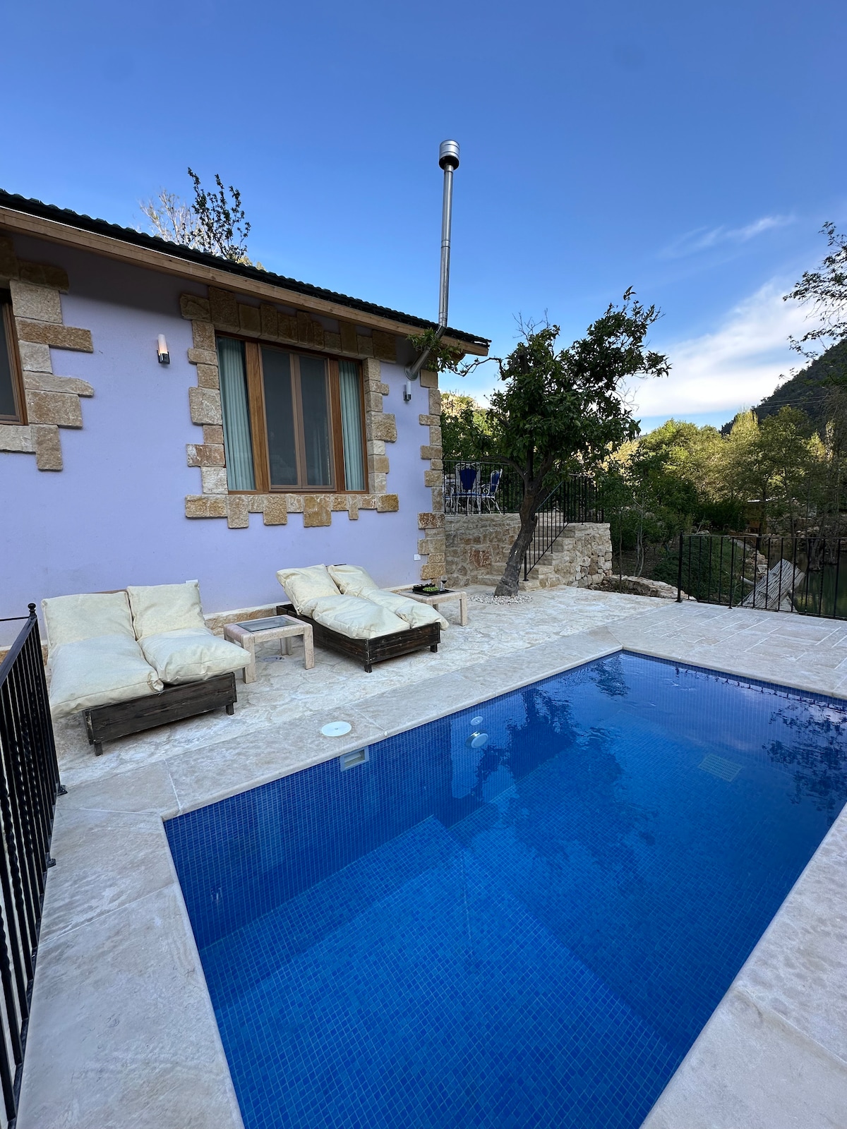 Kick back and relax in this 2 bed-room modern cabin with spacious private outdoor space and a private pool right next to the river hosted by Riverside Jahliye and located only 35 minutes away from Beirut. Have a walk by the tranquil river and experience the ultimate mountain retreat. Wake up to breathtaking mountain and river views from the comfort of your balcony.