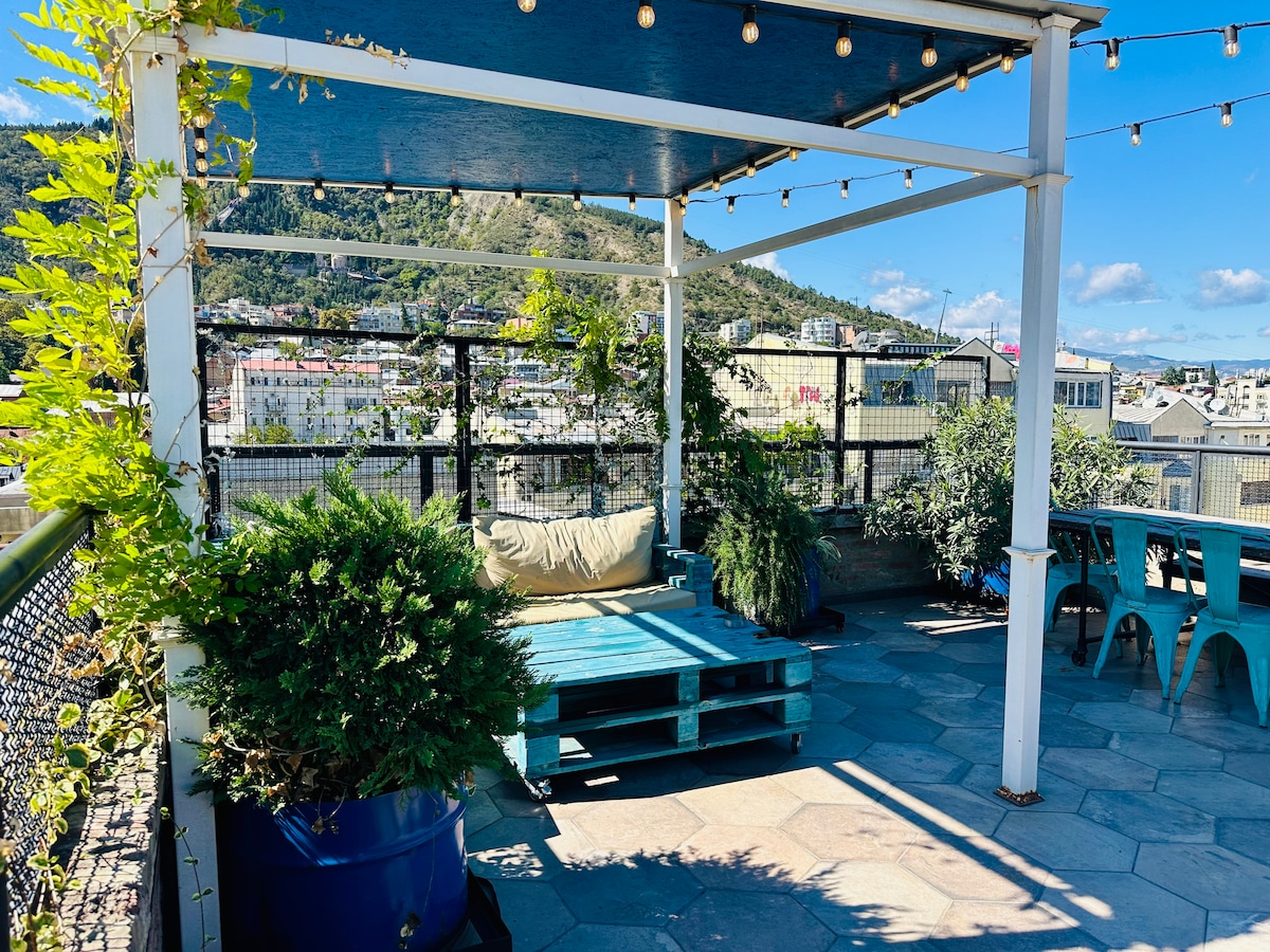 Amazing top floor apartment in the very center of a historical center of Tbilisi. The apartment can offer you a huge terrace with a grilling table, a cozy remote control fireplace, a mezzanine bedroom, AC, bathroom with a bathtub and a washing machine. The apartment is suitable for four people. Within a walking distance you will find many cafes, bars, restaurants, historical sightseeings, famous sulfur baths and a beautiful Botanical garden.