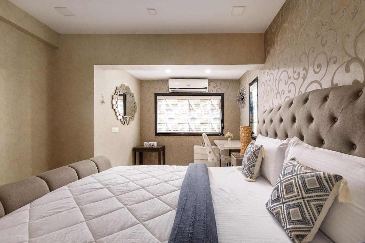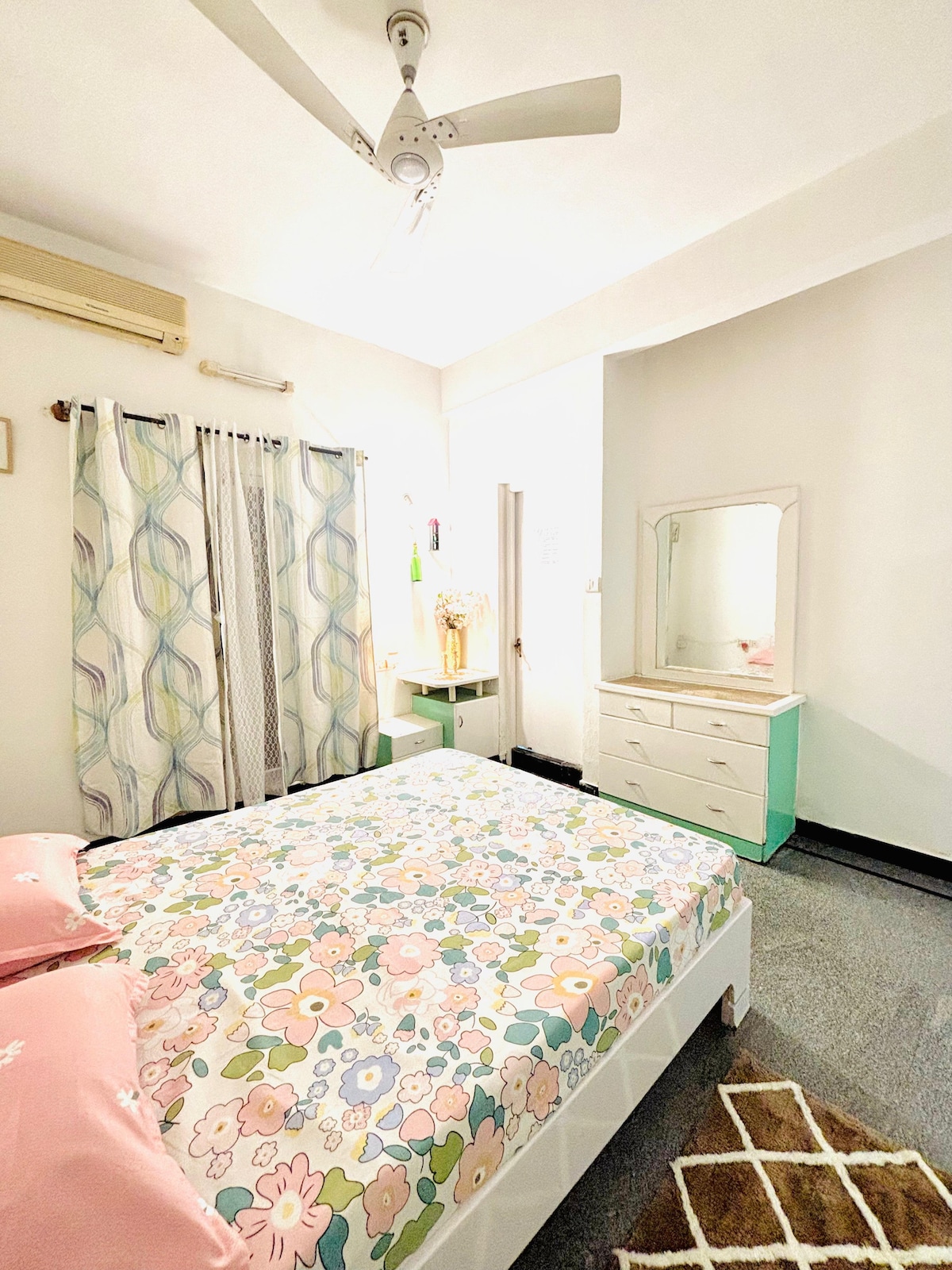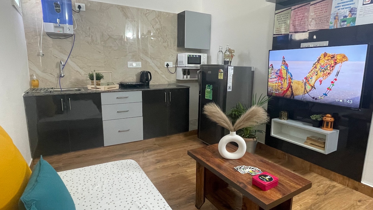 Welcome to our brand new, spacious 1-BHK flat, ideal for couples and families seeking comfort and convenience. The bedroom boasts a queen bed and soft orthopedic mattress for a restful night's sleep. Relax in the large living room with a 43-inch Smart TV, lightning-fast WiFi and dedicated workspace. Comes with a super clean bathroom stocked with essentials. The fully equipped kitchen includes basic ingredients, high-quality appliances, and crockery for your culinary adventures.