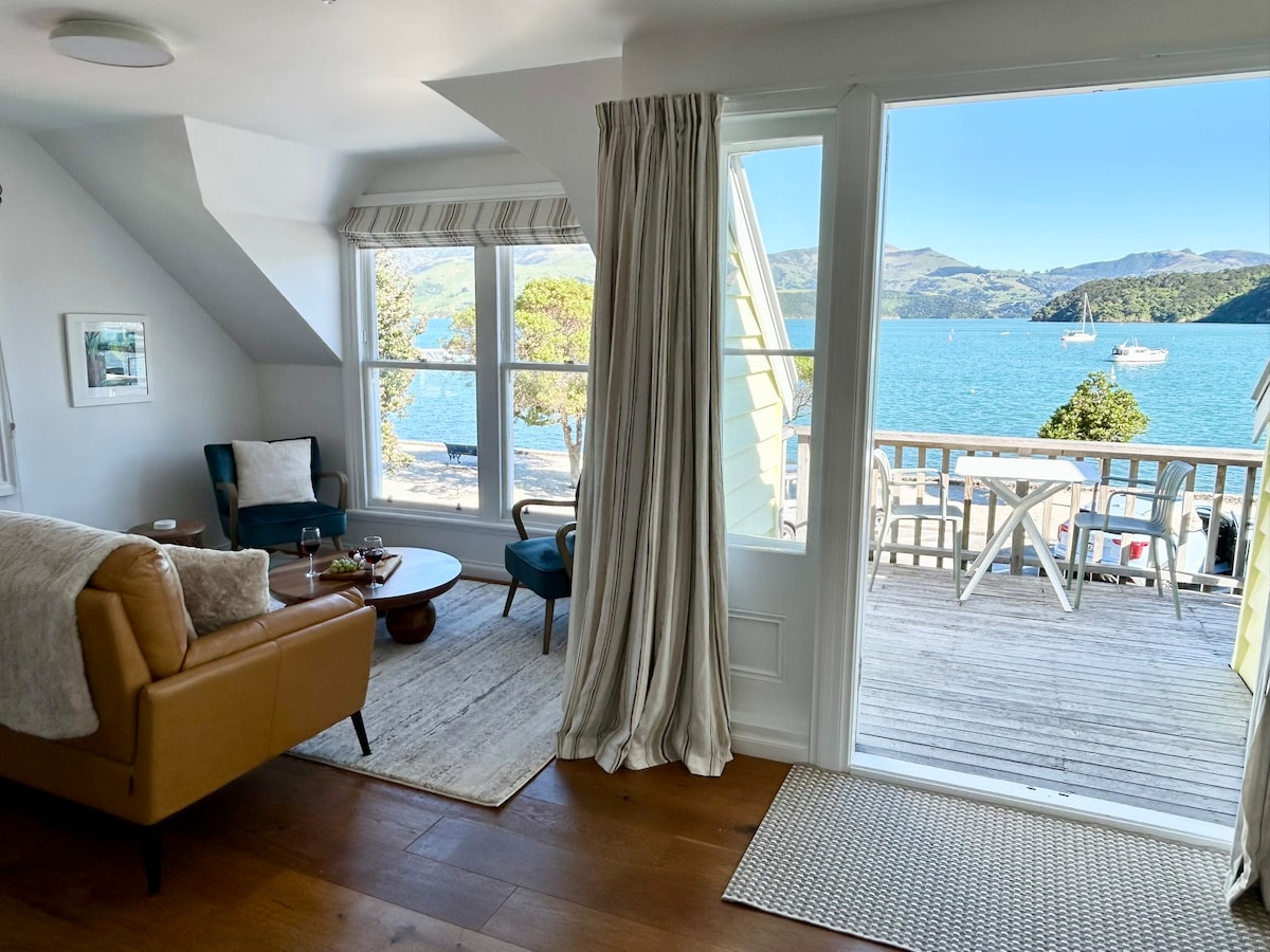 Absolute Waterfront in the Heart of Akaroa A wonderful modern apartment in Akaroa on the Banks Peninsula; conveniently located on the main street in the village and featuring some of the best views in Akaroa. Our holiday apartment is a fantastic getaway for a couple or a family. Light and spacious, just the recipe for a relaxing holiday by the sea. A separate kitchenette and large living area allows enough room to spread out. Free off-street parking is provided for one car.