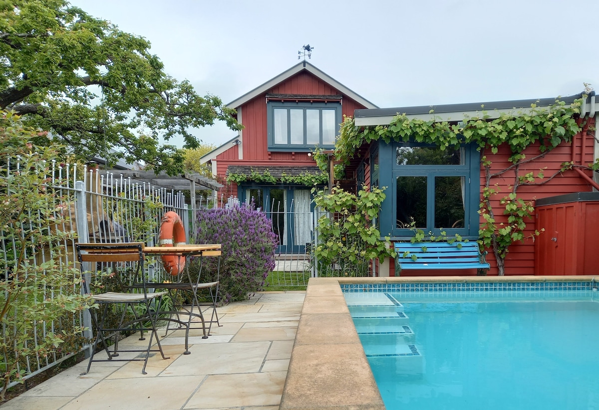 Includes self-catered continental breakfast - please advise if you would like breakfast or not. A unique, sunny, compact studio set in an established back garden in a quiet neighbourhood. The garden is a shared space with us - two adults. Enjoy eating outdoors, relax under the mature trees, have a swim during summer. Fridge, microwave, toaster for simple heat/eat meals. Merivale 10 mins walk - shops/dining; CBD 40 mins walk. California King sized bed. Library of books about NZ, DVDs