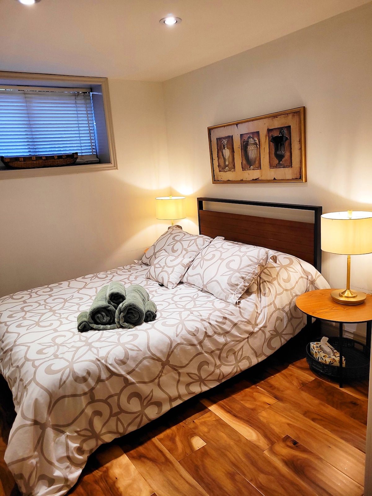 From the exposed brick, to original artwork, to massive private bathroom with double vanity, this basement suite in our home has been renovated and decorated to feel like a loft. The double bed is brand new with a 16" mattress sure to deliver an excellent night's sleep. You will find a brand new, 42" smart TV resting on a unique mantlepiece refashioned from an antique upright piano, as well as a kitchenette with convection oven/air fryer, Keurig coffeemaker, and stainless steel mini fridge.