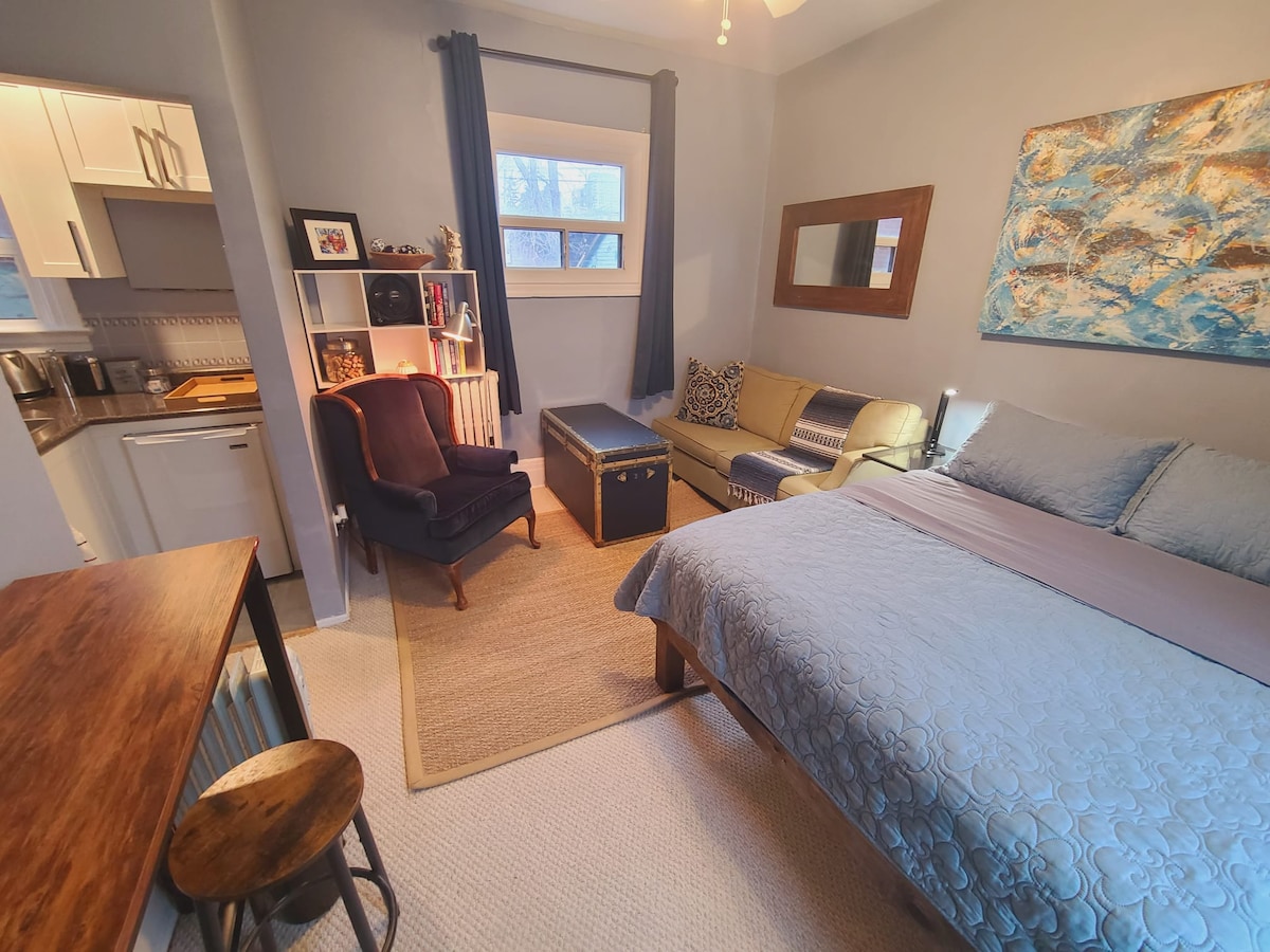 Sparkling CLEAN, SELF-SUFFICIENT, Downtown, Small, Stylish hotel-room-like, Private Deck for smoking/vaping and Fire Escape. QUEEN BED. No shared spaces. Very secluded and safe for female solos, with LOCKBOX 24/7 arrival/departures. Location across from upscale Summerhill Market in the vibrant Annex neighborhood. Bustling street, DOWNTOWN, urban location. Private entrance, fire escape for you only. What you see in pictures is what you get.