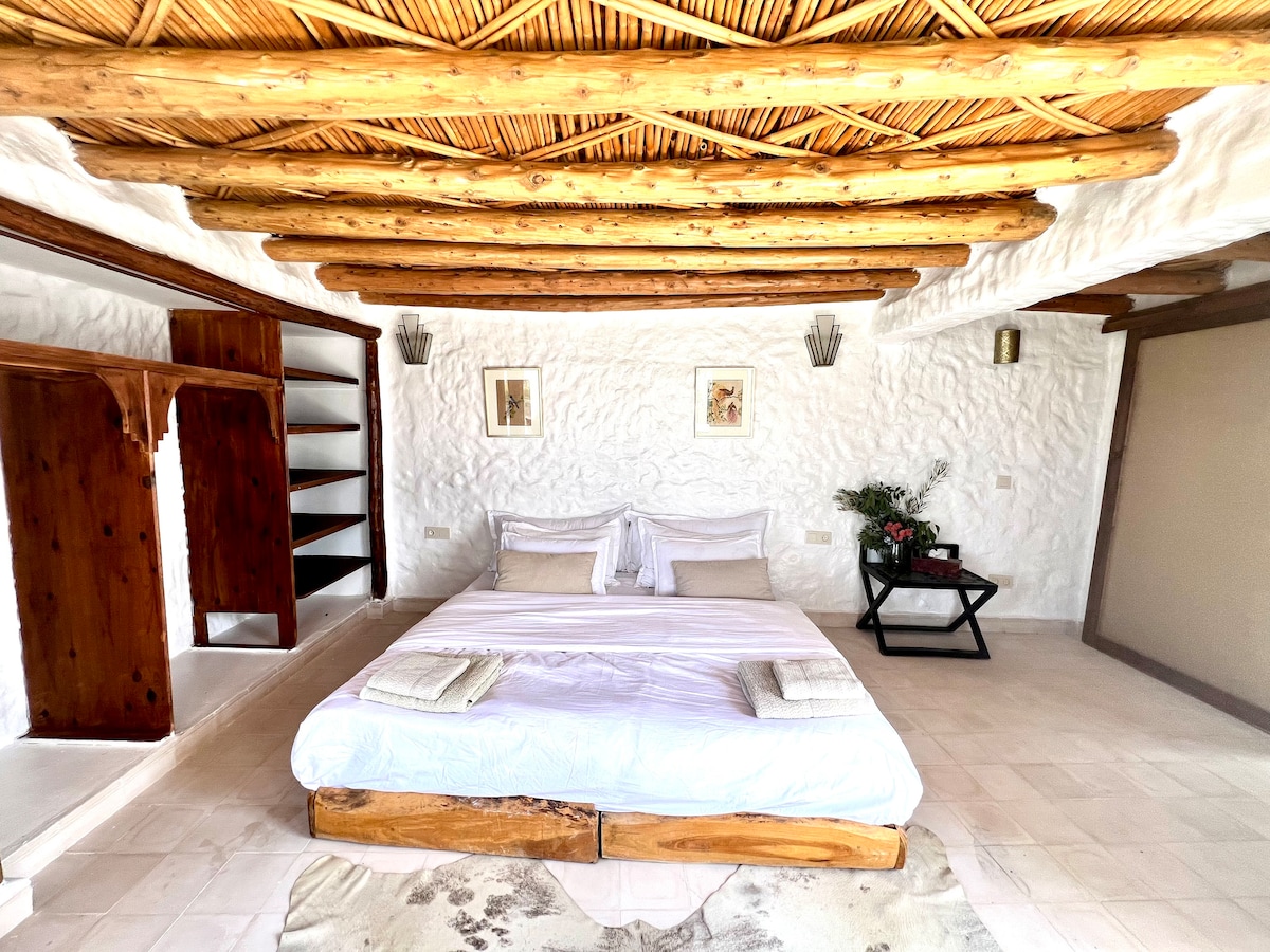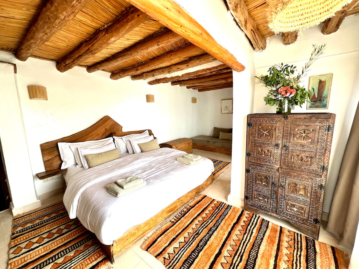 Blotti au coeur du parc national Souss Massa, le site est un Eden secret, posé en sentinelle à l'embouchure d'un oued traversé de nombreuses espèces d'oiseaux rares, portés par l'alizé depuis la réserve ornithologique. Dressée sur une plage de sable fin, la maison est ornée de décoration traditionnelle, authentique et raffinée, elle ouvre l'intégralité de ses fenêtres sur l'Ocean Détendez-vous dans ce Havre de paix unique et authentique avec une vue sublime sur l'océan et la plage de Sidi Rbat