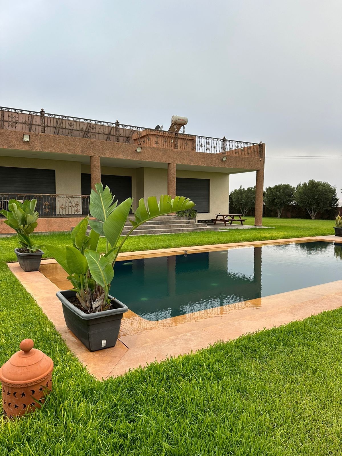 Située à Takate Agadir, Janane Yaya (7F33+RM, Takate, Morocco) est une villa écologique sur un terrain vert de 8000m² comprenant trois chambres et trois salles de bains, une cuisine bien équipée, un lave-linge, ainsi que quatre salons confortables. Les installations comprennent une piscine impeccable, un parking gratuit, et un terrain de football et basketball. Les invités bénéficient également d'une connexion Wi-Fi en fibre optique , ainsi que d'un Hammam Beldi traditionnel pour se détendre.