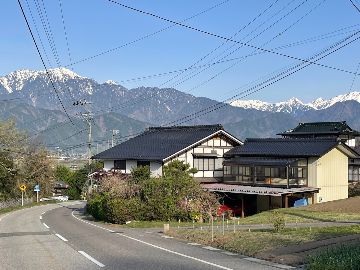 白馬まで車で30分、上高地や立山黒部アルペンルート観光に便利な一棟貸切の宿です。 広々4LDKでファミリーや落ち着いた大人のグループに最適。 お庭でBBQも楽しめ、静かでプライベートな滞在をお約束します。 ◻︎ 田畑に囲まれた壮大な敷地に建つ、開放感あふれる一棟貸切の宿です。 木のぬくもりが心地よく、窓の外には四季折々の美しい景色が広がり、心を解きほぐしてくれます。 住宅は高台に建ち、眼下には市街地や田園風景が広がり、その先には北アルプスの絶景が一望できます。 朝昼夜で表情を変える雄大な景色を眺めながら、非日常のひとときをお過ごしください。 ここは、ただ「泊まる」だけの場所ではありません。 日常を忘れさせてくれる開放的な空間、静寂に包まれた自然の中で深呼吸する贅沢な時間――心と体をリフレッシュできる特別な滞在をお約束します。 まるでご自分の別荘のようにゆったりと過ごし、心からリフレッシュするひとときをお楽しみください。 ※大音量での音楽やにぎやかなパーティ目的のご利用はご遠慮ください。 ◻︎