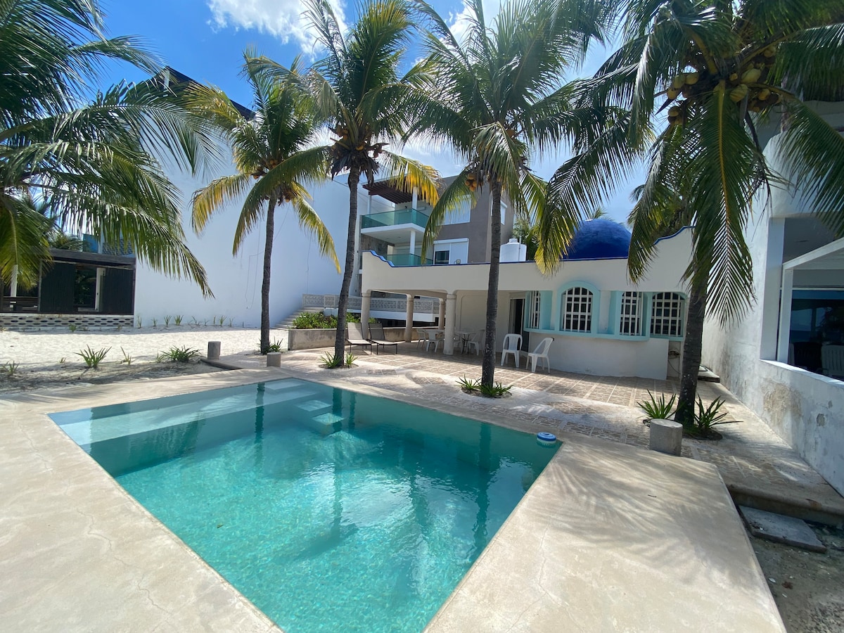 Casa en la playa frente al mar, con vista y acceso directo al mar. 3 cuartos con balcón, uno de servicio dentro de la casa y un cuarto adicional atrás. Piscina/alberca, jacuzzi, terraza en la azotea, bar y barra, terraza con palapa, comedor, cocina completa, sala de TV, segundo piso con 3 cuartos y azotea con terraza. Estacionamiento techado para 2 coches, acceso privado y seguridad 24/7 Ubicada a 15 metros de la orilla del mar, a 10 minutos de puerto progreso y 40 minutos de Mérida