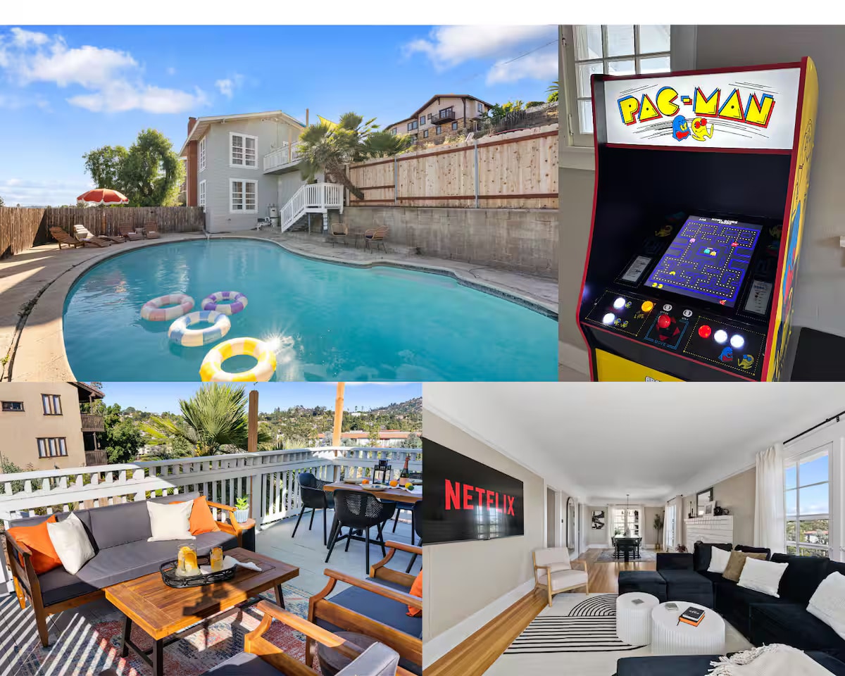 Beautiful family vacation retreat! Amazing backyard includes your own private heated pool, a spacious deck for relaxing with lounge chairs, dining spaces, and fire table. Fenced for privacy. Inside enjoy the game room and arcade, smart TVs located throughout the house, and air conditioning. Strong Wi-Fi signal, including the outdoor deck area. Amazing location close to all SD has to offer: within 20 minutes of the zoo, beaches, Sea World, downtown, and the airport! Private parking.