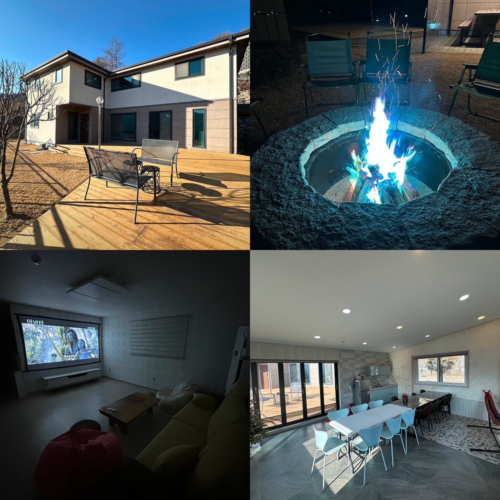 도심의 소음에서 완전히 벗어나, 오직 바람 소리와 별빛만 가득한 울창한 숲속 독채 공간입니다. 층별로 완벽히 분리된 테마를 통해 깊은 휴식을 경험해 보세요. ✨ 1F : Industrial Bar & Kitchen (소통의 공간) 거칠면서도 따뜻한 인더스트리얼 무드의 1층은 오직 당신만을 위한 프라이빗 바(Bar)가 됩니다. 벽난로: 타닥타닥 타오르는 불멍과 함께 즐기는 와인 한 잔. 다이닝 공간: 세련된 대형 테이블에서 즐기는 근사한 만찬과 깊은 대화. ✨ 2F : Cozy Relax Zone (휴식의 공간) 2층은 온전한 쉼을 위해 설계되었습니다. 원룸 형태의 개방감과 실용적인 공간 분리가 돋보입니다. 공간 분리: 침실과 욕실, 그리고 독립된 드레스룸이 각각 나뉘어 있어 짐을 깔끔하게 정리하고 쾌적하게 머무실 수 있습니다. 프라이빗 테라스: 문을 열면 숲을 붉게 물들이는 석양과 밤하늘 가득 쏟아지는 별빛이 여러분을 맞이합니다.