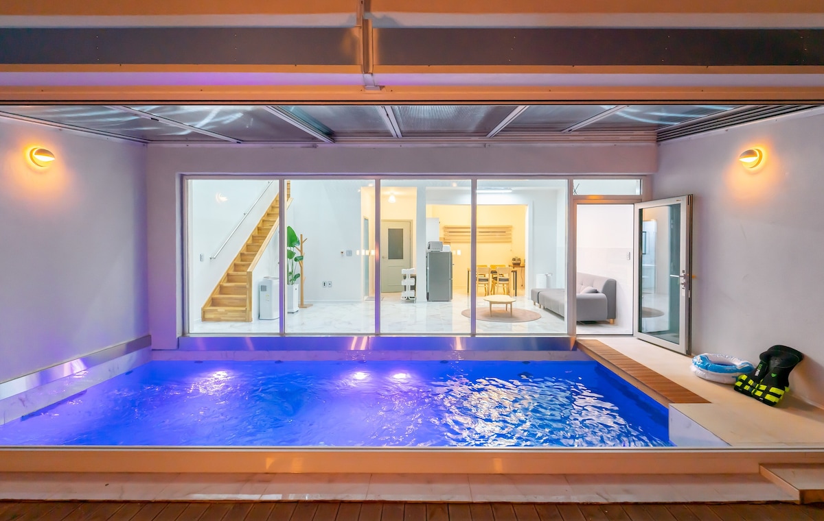 ☞ 단 한팀만 예약받는 독채풀빌라펜션 펜션지기가 거주하면서 직접 세심하게 관리 운영하는 펜션입니다. *톡hueruem *폰 5299-2913 ※ 관리동이 있어 언제든 머무르는 동안 게스트 불편없는서비스제공 ※ 고급 오가닉 순면 침구, 타올, 친환경세제로 직접 세탁한 침구 매일 교체. ※ 온수풀무료유지 자동필터, 직접청소로 청결 유지 ※ 친환경 (오가닉) 욕실용품(바디워시, 샴퓨, 트리트먼트) ※ 추가 침구 제공 ※ 세탁서비스 ◈ 넓은 실내수영장, 침실3(퀸침대2, 싱글침대2), 화장실2, 주방, 거실, 넓은 바베큐데크(몽골텐트), 8인용식탁 다이닝 룸, 티비,소파룸 거실, 테라스 ▶ 정수기, 의류탈수기, 티비(넷플릭스무료), 냉장고, 시스템에어컨, 도킹스피커, 미니오븐, 전기밥솥, 전자렌지, 전기포트, 네스프레소캡슐커피, 식기조리도구 ▶기본양념, 타올, 세면도구, 헤어드리이어, 샴푸, 트리트먼트, 바디핸드워시, 튜브 물놀이용품, 놀이감 등
