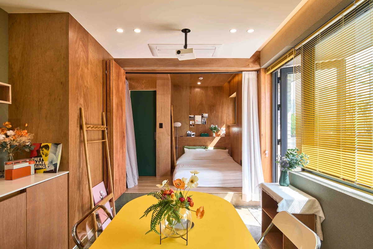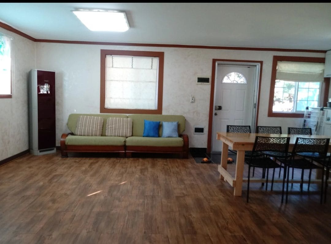 位于神井湖畔的独特小屋 这座别致的农舍位于牙山市神井湖旁,经过精心改造,融合了温馨与时尚。牙山市有丰富的旅游资源,如Pinnacle Land、公世里圣堂、外岩村、民俗博物馆、温泉和灵仁山滑索等。距离小屋仅100米的神井湖于2025年被指定为忠清南道首个地方庭园公园,是全年适合散步和慢跑的地方。湖周围还有许多餐厅和咖啡馆,让您尽享城乡结合的独特魅力。 这间小屋与房东居住的区域(A区)位于同一栋建筑内,通过一扇开合门分隔,确保互不干扰。客人专属的B区拥有独立的入口以及连接果园的露台。露台设有凉亭,您可以尽情享受宁静的乡村氛围。室内采用开放式设计,设有大窗户、6人餐桌、两张超单人床和宽敞的沙发,为您提供舒适的入住体验。