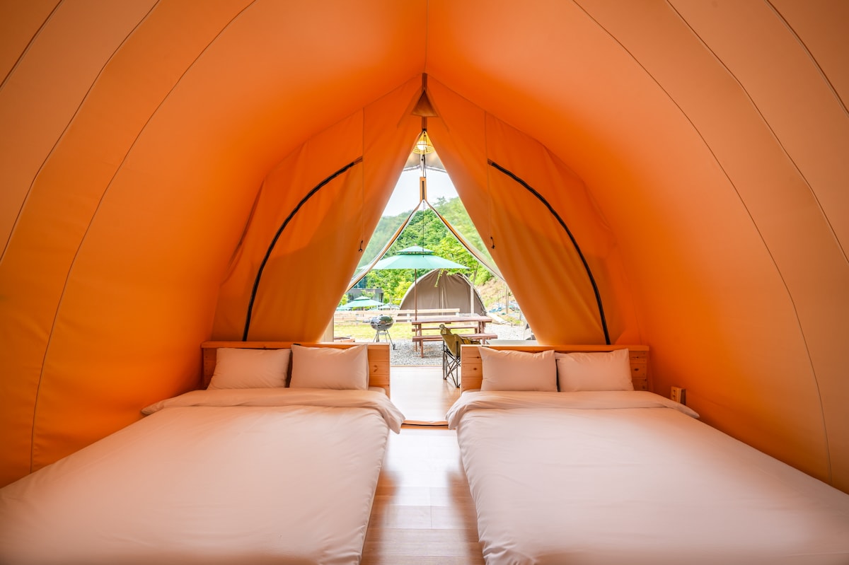 This is Park of Dream, a representative glamping site in Korea. It is an hour away from Seongsimdang, a famous bakery in Daejeon, and within 30 minutes are Muryeong Royal Tomb and Gongsanseong, cultural heritages of Korea. You can look back on Korean history and famous bakeries, and right in front is Gyeryong Mountain, a place loved by many hikers. This is Park of Dream glamping site, a space where you can fully experience Korea's nature.