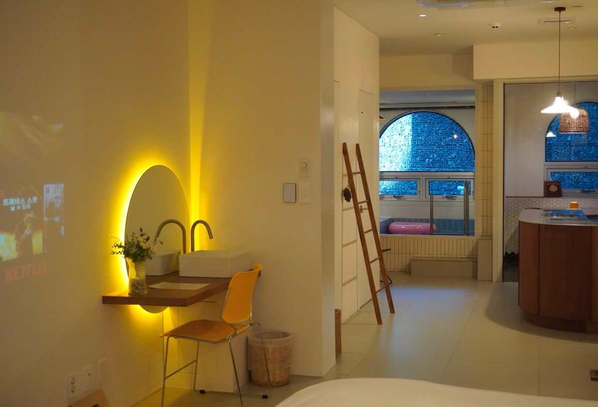 강렬한 원색의 가구와 소품들이 포인트! 귀엽고 아기자기한 소품과 다채로운 색깔의 오브제를 감상하며 숙박하는 느낌은 어떨까요? 귀여운 스마일이 새겨진 실내화를 신고 보핑거 체어에 앉아보세요! 아르떼미떼 조명과 애플 올드맥의 오브제는 우리의 호기심을 자극하며 즐거운 시간을 제공해드립니다 호텔홀라인을 통해 몸과 마음을 재충전하는 휴식은 일상으로 다시 발돋움하기 위해 꼭 필요하죠