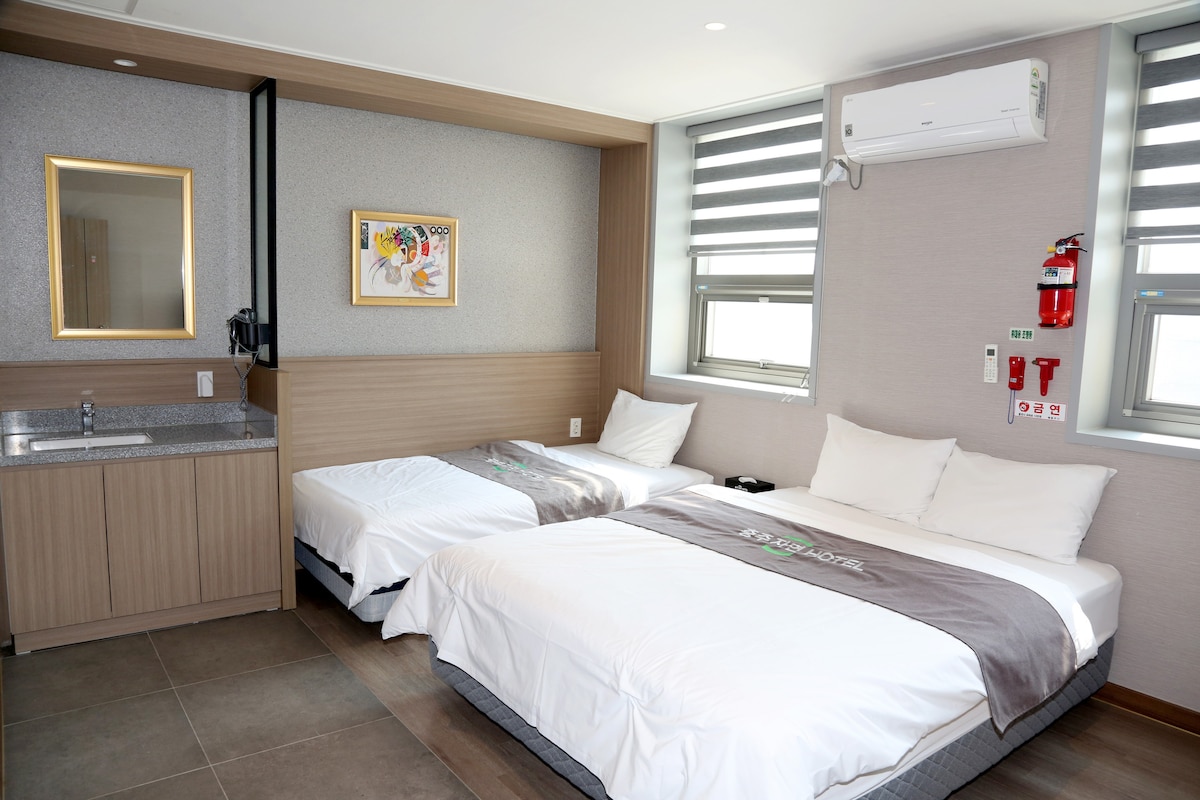 라탄과 우드 그리고 식물의 조합으로 이국적인 여행지에 온듯한 기분을 느낄 수 있습니다. 자연이 선사하는 힐링을 충분히 만끽하고 가세요! 라탄 실내화를 신고 페르시안 카페트 위 라탄의자에 앉아 티 한잔 마셔보셨나요? 오리지널 스테인글라스 유럽 조명과 라탄조명이 한껏 편안한 분위기를 만들어줄 거예요! 호텔홀라인을 통해 몸과 마음을 재충전하는 휴식은 일상으로 다시 발돋움하기 위해 꼭 필요하죠 스탠바이미 제공 침대 속에서 뒹굴거리며 스탠바이미로 넷플릭스 정주행하는 것 또한 휴식이자 힐링 아닐까요? 객실 구성 퀸사이즈 침대1개, 라탄 선반, 유목전신거울, 라탄테이블, 라탄 의자2개,화장대 의자1개, 카페트, 보만 냉장고, 스탠바이미, 화이트 침구, 옷걸이2개, 라탄슬리퍼, 드롱기 전기포트, 드라이기, 면봉, 화장솜, 빗, 펜, 펜거치대, 메모지, 타올 수건, 샴푸, 린스, 폼클렌징, 바디샤워, 치약, 대나무칫솔 2개, 오프너, 대추나무소주잔, 아웃도어 잡지, 휴지