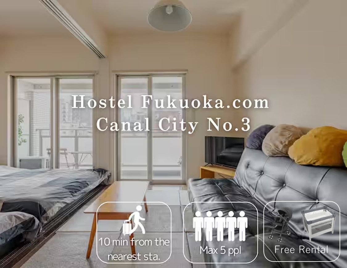 通常入住人数为2人时,默认为其准备一张双人床,一套双人床品、枕头。如有需要分开睡觉时,请在预订后入住前与我们联系。 房间提供生活所需便利设施,吹风机、毛巾、浴巾、一次性牙刷(每位客人提供一支)、洗面奶、洗衣液、平底锅、煮锅、餐具、餐盘、碗盘、刀、剪刀、水杯、电磁炉(房间内禁止使用明火) 房源位于福冈市中心,步行至博多运河城只需3分钟,近商圈,周边配套齐全,711、全家便利店、烘干店步行只需2分钟,另有大型超市,人气餐厅、咖啡厅。