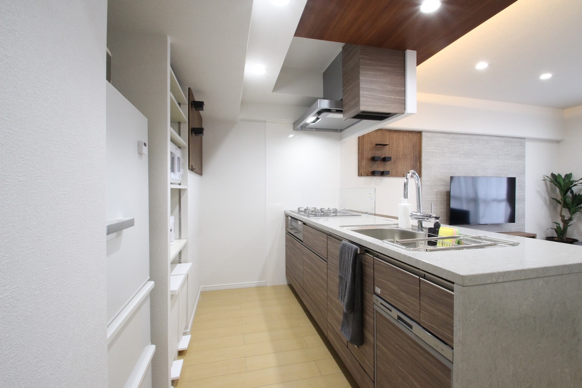 This stunning 50 sq.m 3 bedrooms vacation home is a bright, spacious, convenient, and well equipped to make your stay comfortable & homely. Tenjin subway station, Tenjin bus station, and Nishitetsu Fukuoka station are 10-11 minutes walk away, making this room a perfect base to explore Kyushu. Suitable for families with young&older kids, & groups. Surrounded by local restaurants, cafes, convenient stores, and shops with great access to public transportation. A parking lot is right next.