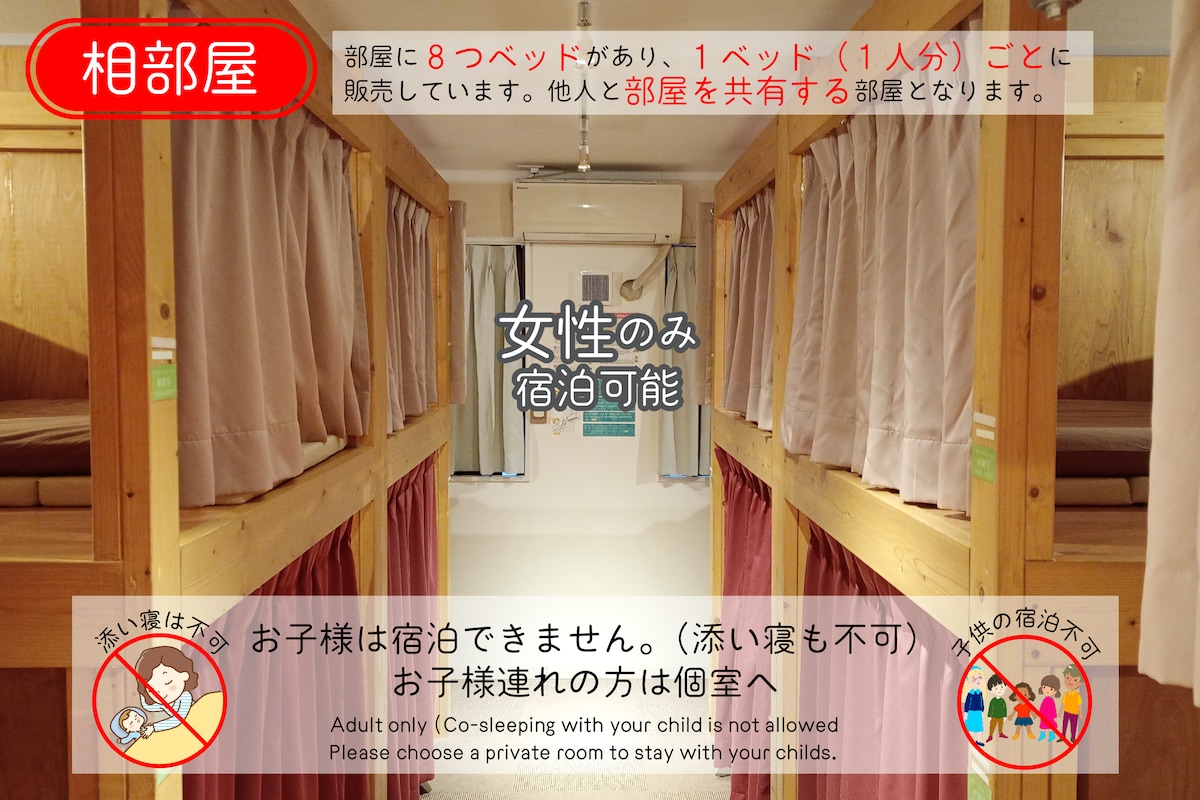 您好,我们是游山青年旅舍(YUZAN Guesthouse )。 本旅舍由具百年历史的日式古民宅改装而成,近铁奈良站步行4分钟,JR奈良站步行10分钟,奈良公园步行15分钟可达。 我们主要是提供背包客住宿的简易青年旅馆,虽无法提供像一般饭店的全套式服务和住宿环境,但设有厨房等自助式公用设施,可降低您的旅游成本。 《房型简介》 ・本房型为女性专用合住房,需与别的房客共用一个房间。 ・房内含两架上下铺式床铺,最多可容纳4人入住。 ・房内无独立卫浴,共用空间设有3间洗手间及2间淋浴间供所有入住房客共用。 ・此房内有专用洗脸台可供盥洗。 《 免费服务 》 ・入住即附浴巾 ・共用厨房备有即溶咖啡、红茶茶包及基本调味料等 ・共用客厅设有1台公用电脑 ・入住前和退房后可免费寄放行李 ・wi-fi (全馆可连) 《 付费服务 》 ・出租用脚踏车:1小时=100日圆 / 5小时以上(至當日22:00)=500日圆 ・投币式洗衣机:1次=200日圆 ・投币式烘衣机:20分钟=100日圆 ・牙刷:50日圆