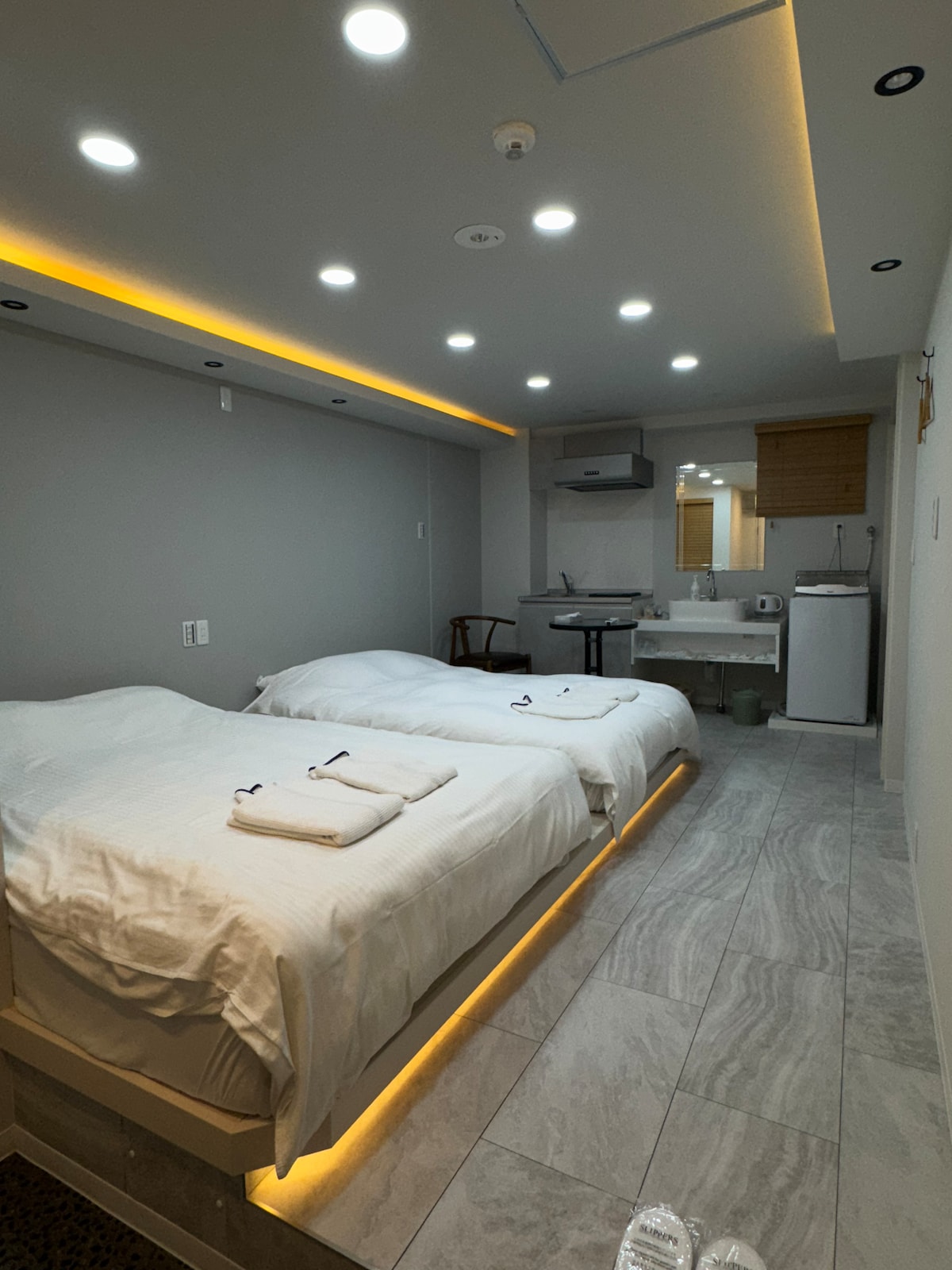 21㎡の広々としたラージツインルーム(120cm幅セミダブルベッド2台)は、陽当たりの良い家庭的なお部屋です!! ■\\\期間限定キャンペーン今だけ実施中!///ミネラルウォーター&ビール人数分プレゼント! ミニキッチン(IH・冷蔵庫・電子レンジ・ケトル付き)で簡単な調理も可能です! ドライヤー、シャンプー、ボディーソープ、バスタオル、歯ブラシを完備し、無料Wi-Fi、地上・BSデジタルテレビ、温水洗浄便座も備えています。 2名様利用を推奨しますが、最大4名様まで宿泊可能です。チェックイン前・チェックアウト後の荷物のお預かりもお任せください! アクセスは心斎橋駅から徒歩1分、心斎橋筋商店街まで徒歩2分。梅田・新大阪・大阪城公園・難波へ乗り換えなしと好立地。ホストも時折受付におりますので、全くの無人ではなく安心です!!(これ大事!) 皆様のお越しを心よりお待ちしております。