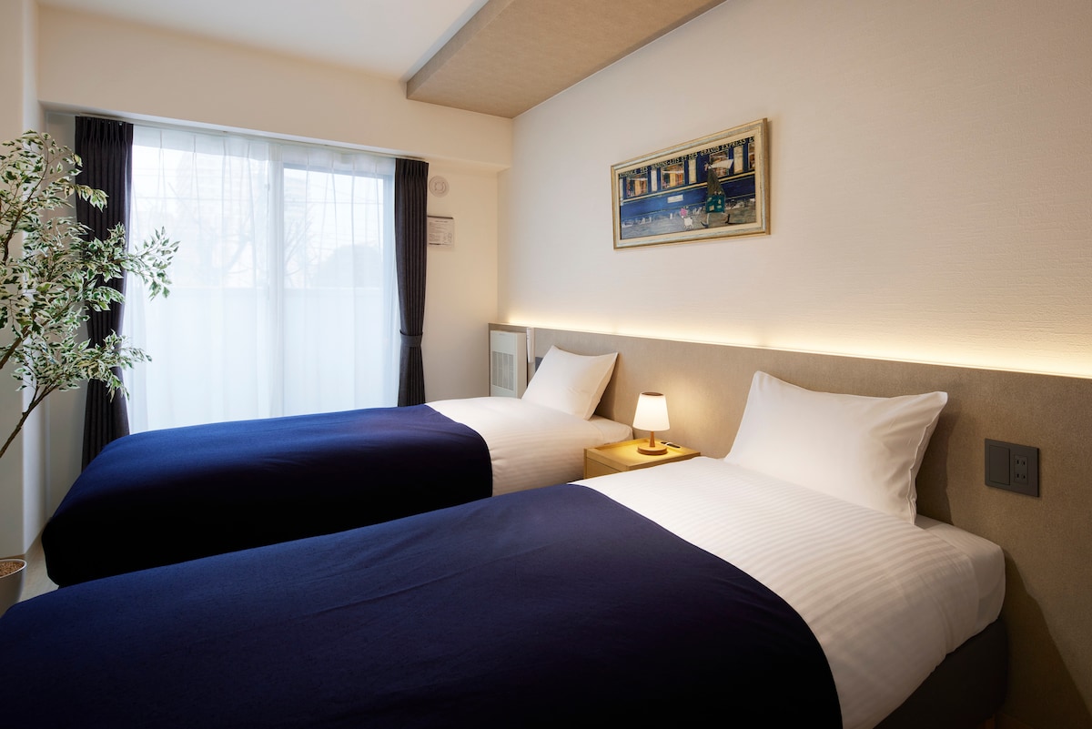 Simple and calm guest room. Enjoy a comfortable journey in a space equipped with shower booths and amenities. Free Wi-Fi is available throughout the building, and you can enjoy the internet in your room or at the cafe on the first floor. We have two semi-double beds with a bed size of 123 cm. <Equipment> 32-inch LCD TV, shower, wash basin, reading light, desk, chair, Fully equipped with air conditioning, refrigerator, hair dryer, electric kettle, etc.