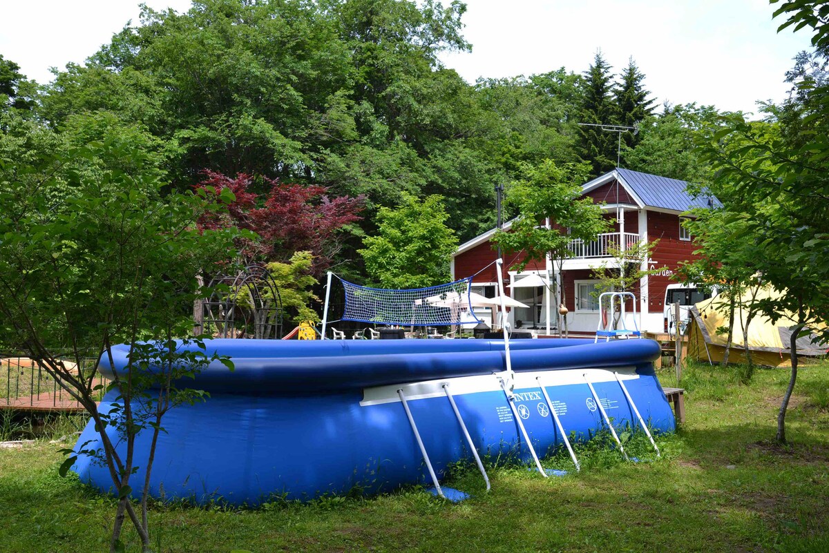札幌市郊外の小さなグランピング場にある古民家をDIY改装したペットと泊まれるシャレーです。冬もやってます。 広い敷地の中に2つの池とBBQスペース(冬も可能)焚火台、ハンモックにブランコ、散策用ウッドデッキ、テント設営も可能です。散策路の先には綺麗な川も。 オプションで、簡易ジャグジー(冬季不可)、7mの簡易プールも設置(夏のみ)屋外サウナがあります。サウナからの川や滝は最高です。 夜は敷地内全てライトアップしてますので、とても綺麗で、まさにおとぎの国。 夜も懐中電灯なしでも歩く事が出来ます。 施設内はすべて天然水で 24時間吹きだしてます。水の音にとても癒され、また、森を50m程歩くときれいな川で釣りや川あそびも出来ます。 天然水のお風呂はとても柔らかく温泉並み。 春は木々の芽生えが美しく、夏はプールにBBQ、秋は素晴らしい紅葉に目を奪われ、冬は貸切、スキーと薪ストーブの暖かさを感じ都会では味わえないまるで森の中のリゾートの様です。 多少騒いでも大丈夫、ガーデンパーティーにも適しています。 オプション ケータリング頼めます。 シェフ付きビュッフェ 3500円〜