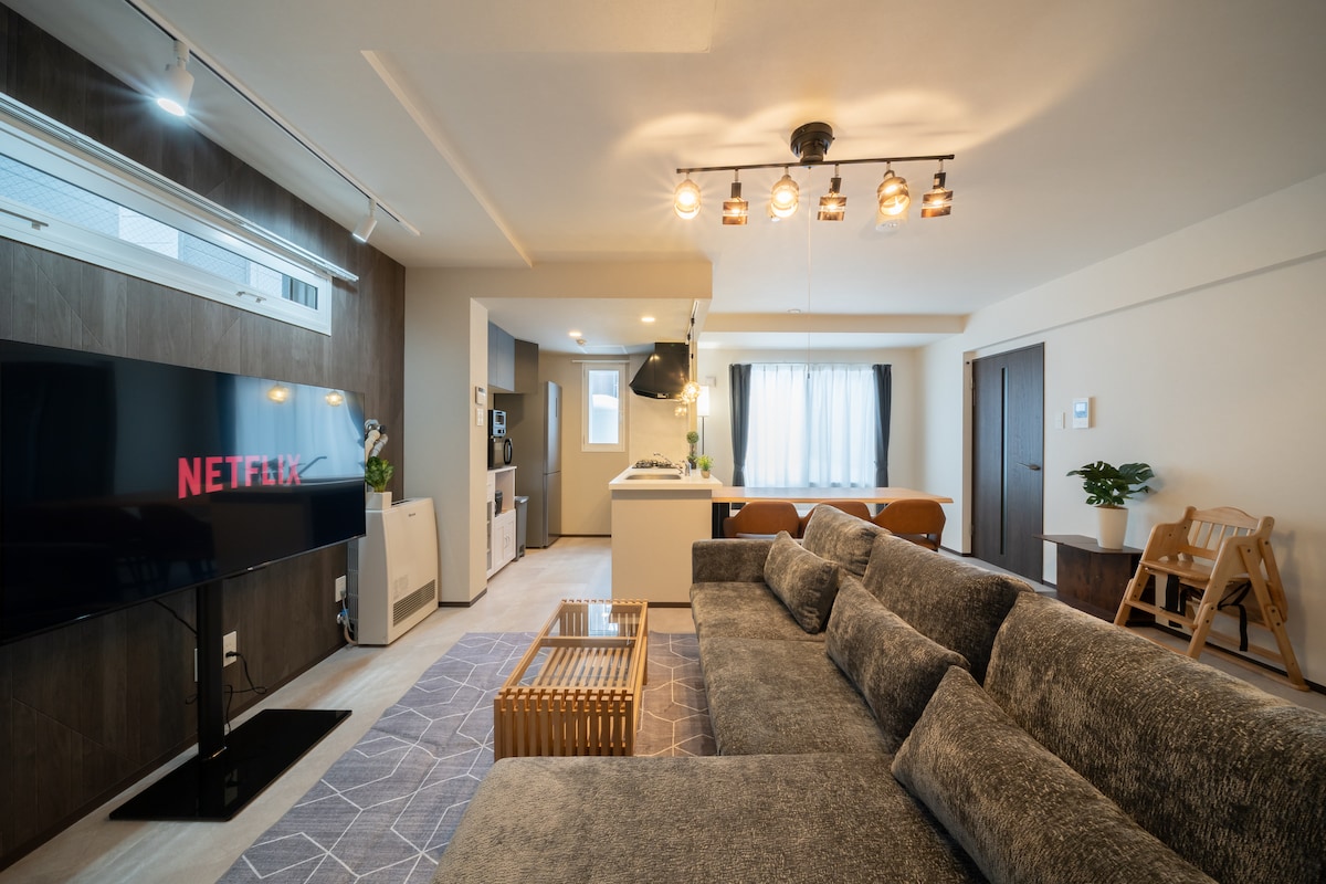 MORI A quiet luxury stay Enjoy a peaceful stay in this 243㎡ luxury private villa, reserved for one group per day. Located in the quiet neighborhood of Miyanomori, it accommodates up to 12 guests, perfect for families and groups visiting Sapporo. Relax in a stylish living space featuring designer furniture by Rolf Benz and Eilersen, enjoy a private sauna, and unwind in a scenic bath with large windows.