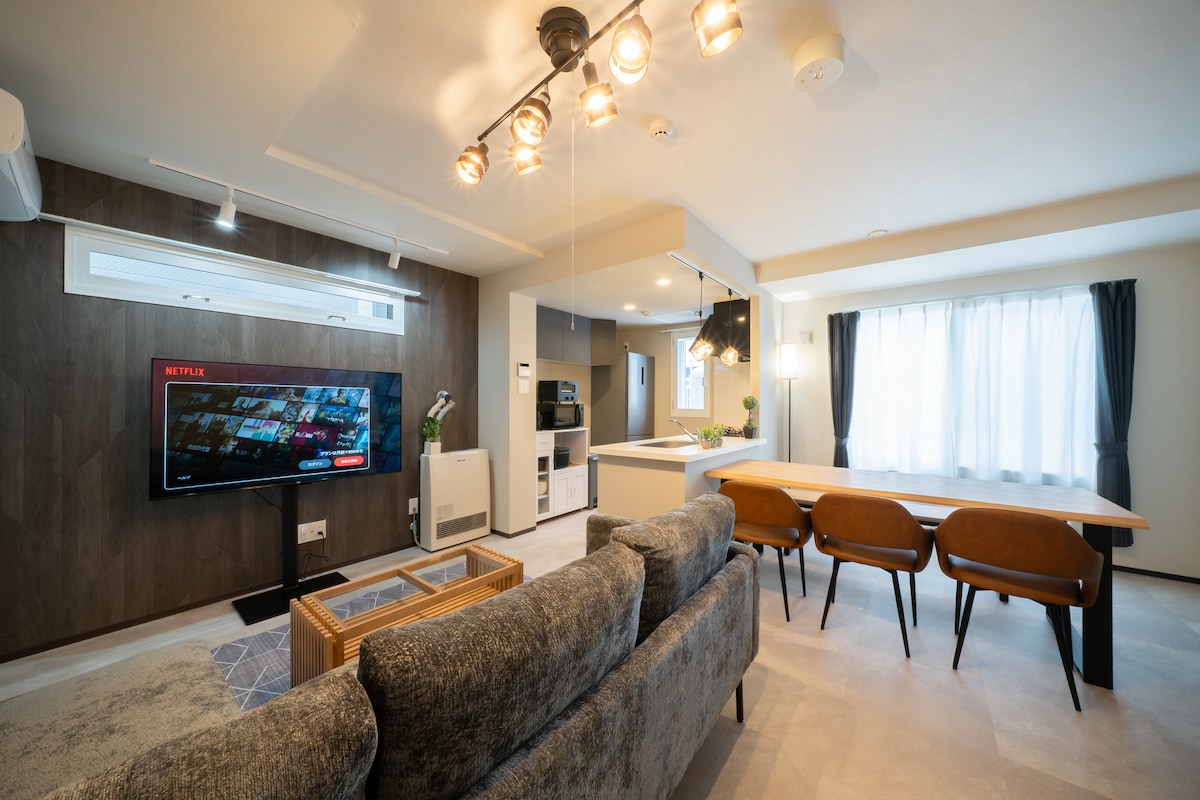 MORI A quiet luxury stay Enjoy a peaceful stay in this 243㎡ luxury private villa, reserved for one group per day. Located in the quiet neighborhood of Miyanomori, it accommodates up to 12 guests, perfect for families and groups visiting Sapporo. Relax in a stylish living space featuring designer furniture by Rolf Benz and Eilersen, enjoy a private sauna, and unwind in a scenic bath with large windows.
