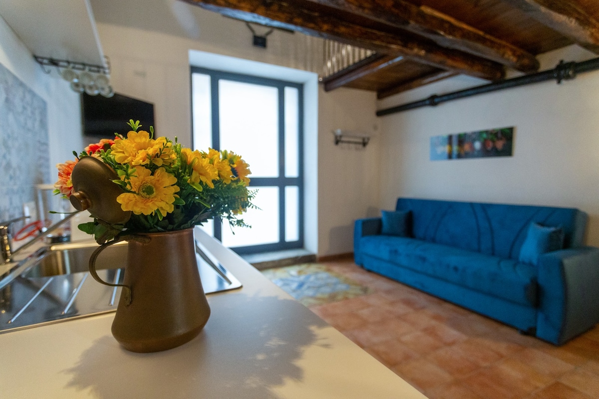 Super centrally-located apartment at the top of a palazzo in the heart of Kalsa, the trendiest neighbourhood in Palermo historic centre. If you manage to make it up the 4th floor of steep stairs (no lift), it will be worth it! The flat has been completely renovated by me, Roman architect who after 10 years of practice in London has decided to move to Palermo and open a studio here. The flat has 2 beautiful terraces, 1 bedroom 1 large kitchen living room, a study and 1 bathroom.