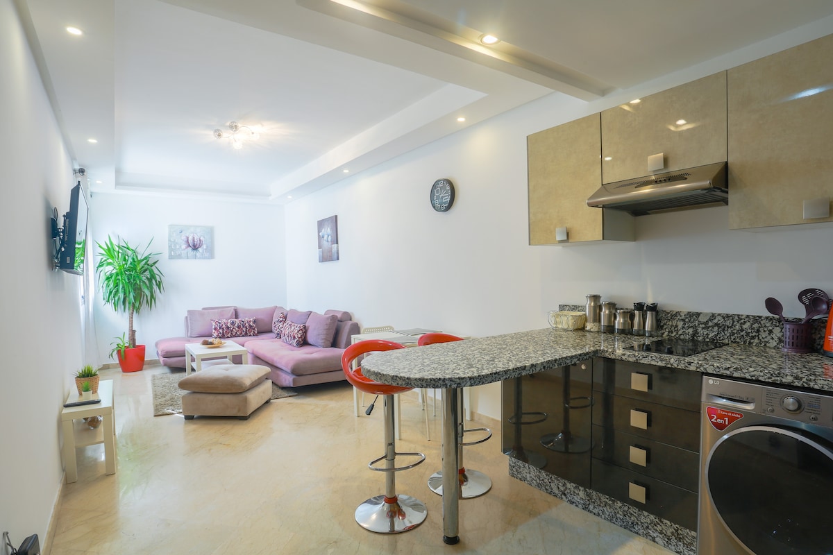 Welcome to this beautiful apartment located in Casablanca’s New Medina, near Habous. Enjoy a refined, thoughtfully designed space with a bright balcony, elegant décor, and modern amenities—ideal for a comfortable stay. A fully equipped kitchen and secure parking ensure convenience and peace of mind. A calm and contemporary retreat where every detail has been carefully considered to make your stay unforgettable.