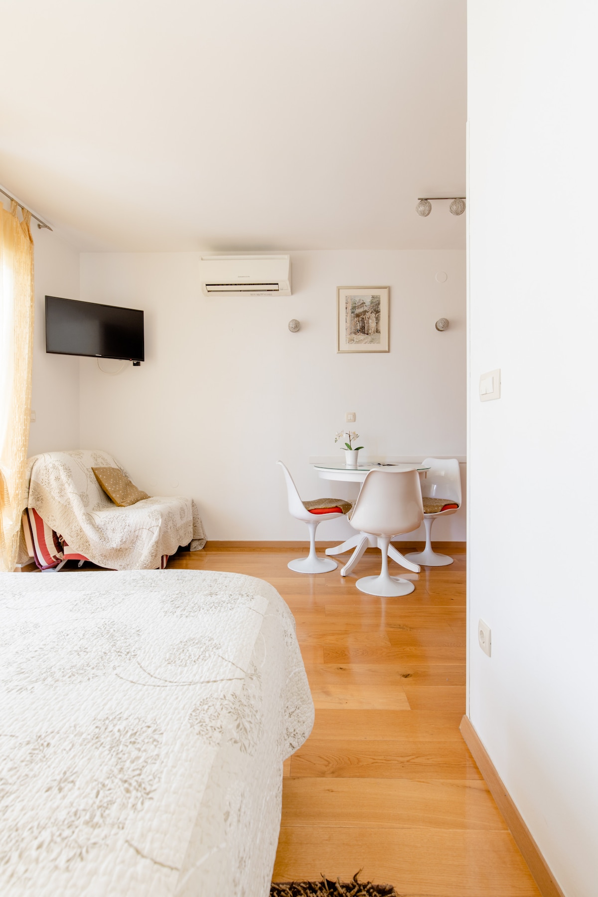 Beautiful new apartment in quiet old town location, with terrace and access to garden with Roman ruins. Enjoy in relaxing luxurious design with touch of tradition and local history. Unique blend of modern living and town history on two steps from living room will leave you breathless. If you like to relax even more, local specialties in quiet garden restaurant are three steps away from your living room. Lighting system, custom made large bed, kitchen, sofa - for perfect stay.